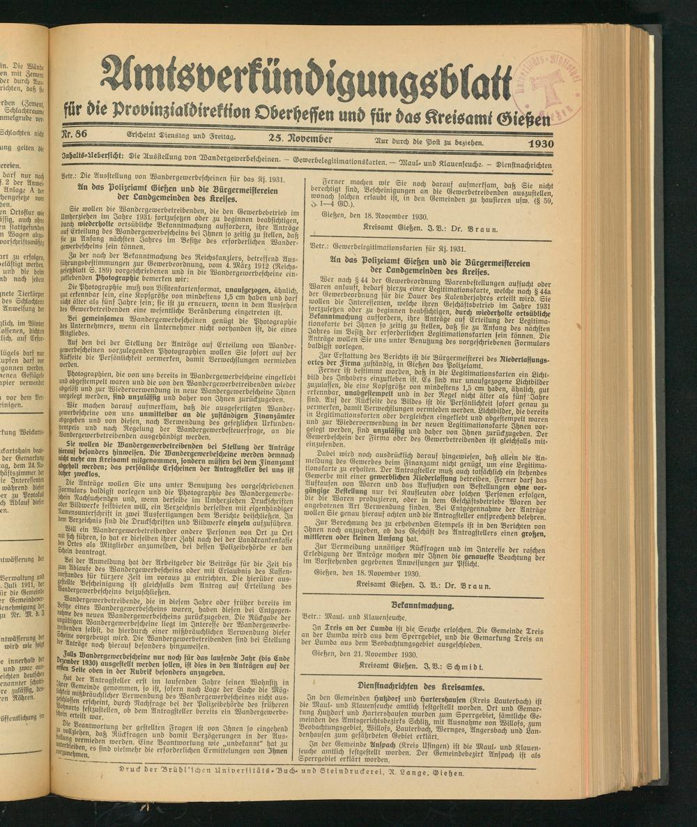 Amtsverkündigungsblatt für die Provinzialdirektion Oberhessen und der Kreisämter Gießen, Friedberg, Büdingen, Lauterbach, Schotten und Alsfeld. 1919-1937