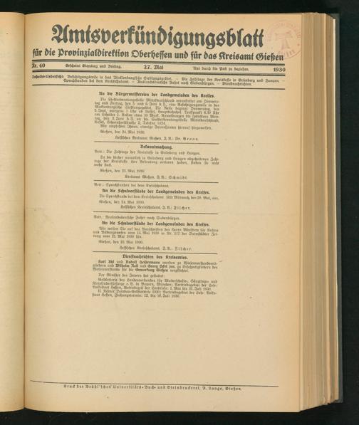 Amtsverkündigungsblatt für die Provinzialdirektion Oberhessen und der Kreisämter Gießen, Friedberg, Büdingen, Lauterbach, Schotten und Alsfeld. 1919-1937