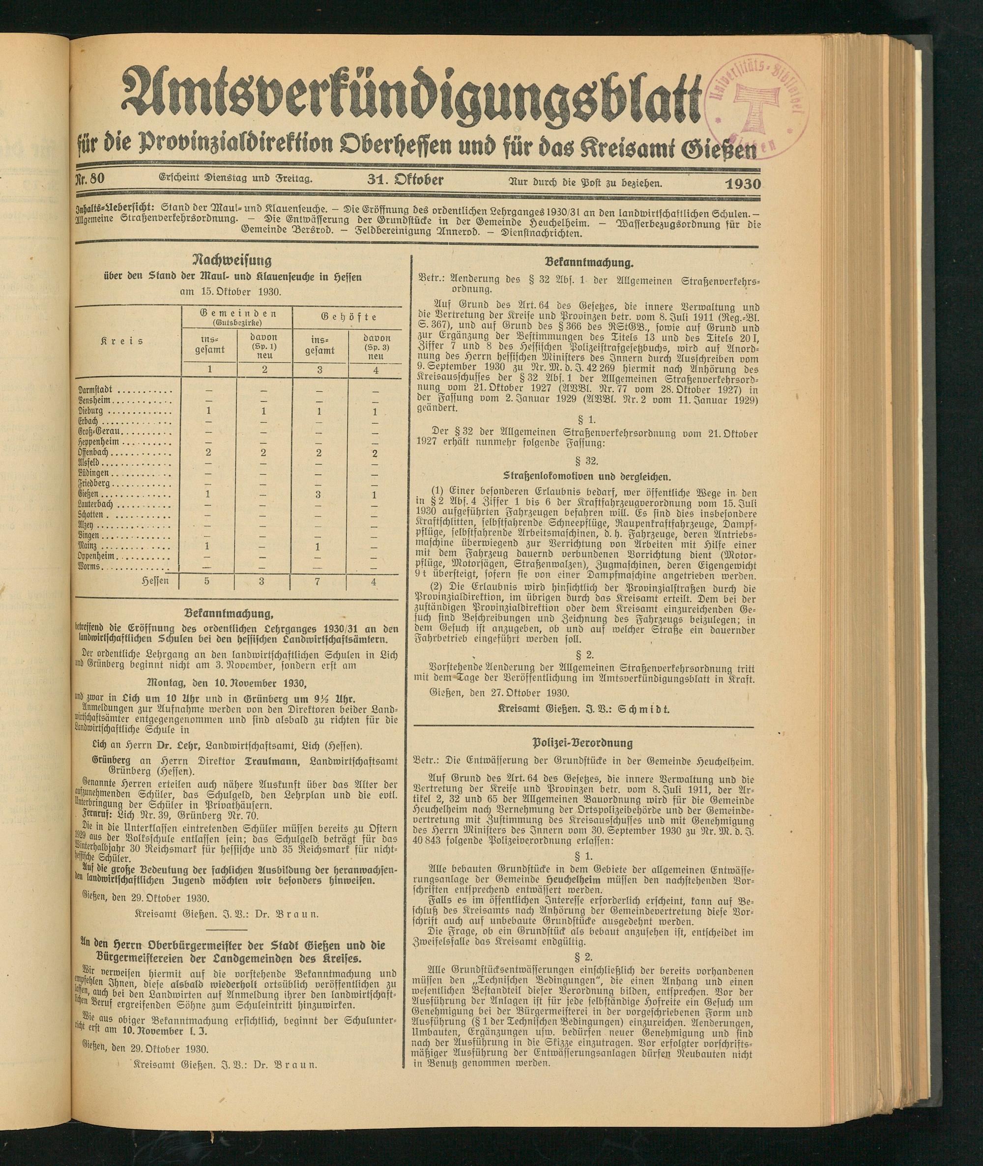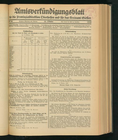 Amtsverkündigungsblatt für die Provinzialdirektion Oberhessen und der Kreisämter Gießen, Friedberg, Büdingen, Lauterbach, Schotten und Alsfeld. 1919-1937