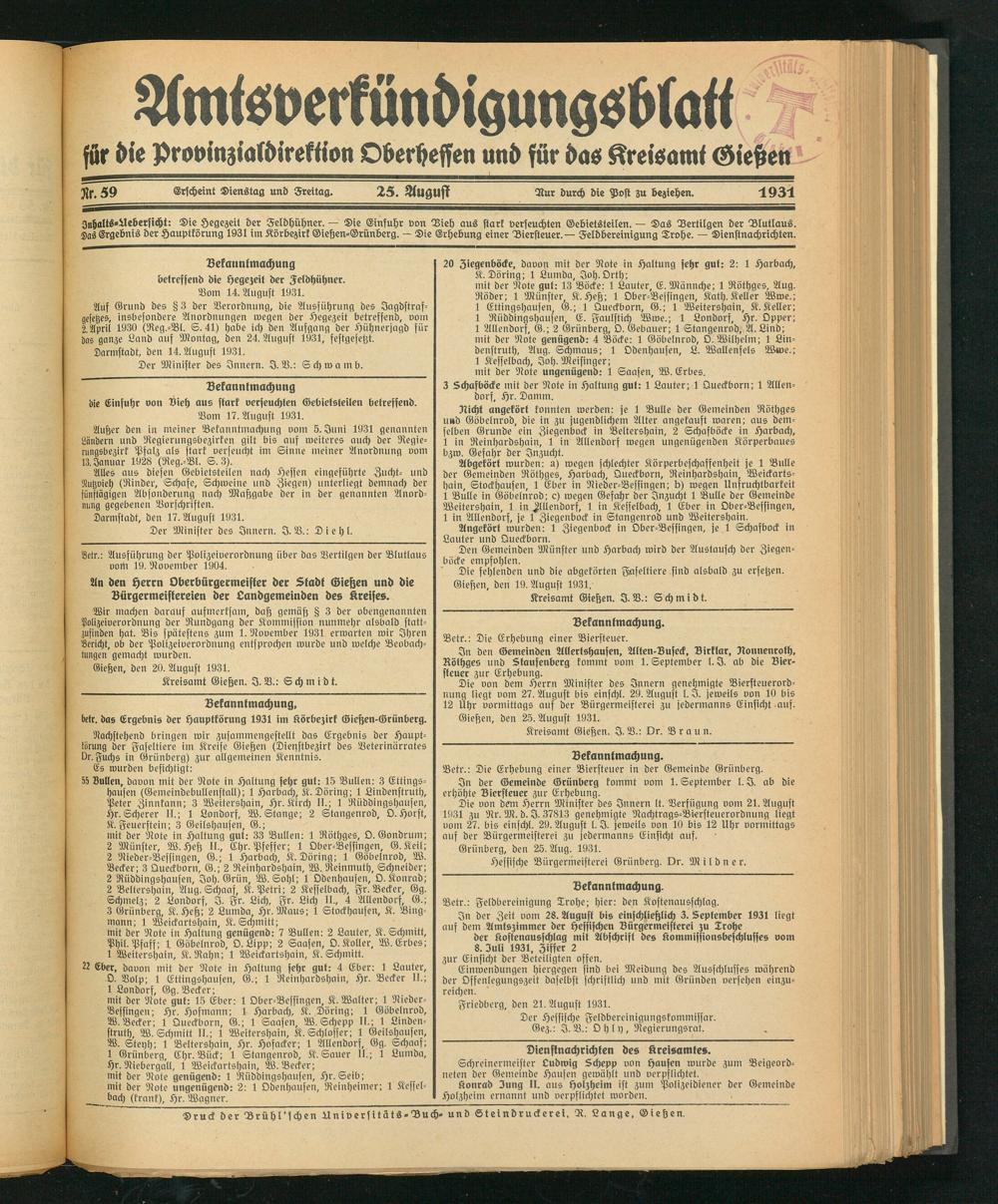 Amtsverkündigungsblatt für die Provinzialdirektion Oberhessen und der Kreisämter Gießen, Friedberg, Büdingen, Lauterbach, Schotten und Alsfeld. 1919-1937