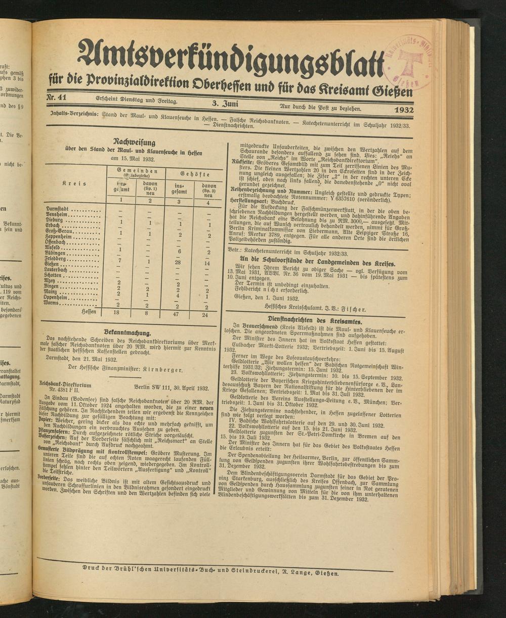 Amtsverkündigungsblatt für die Provinzialdirektion Oberhessen und der Kreisämter Gießen, Friedberg, Büdingen, Lauterbach, Schotten und Alsfeld. 1919-1937