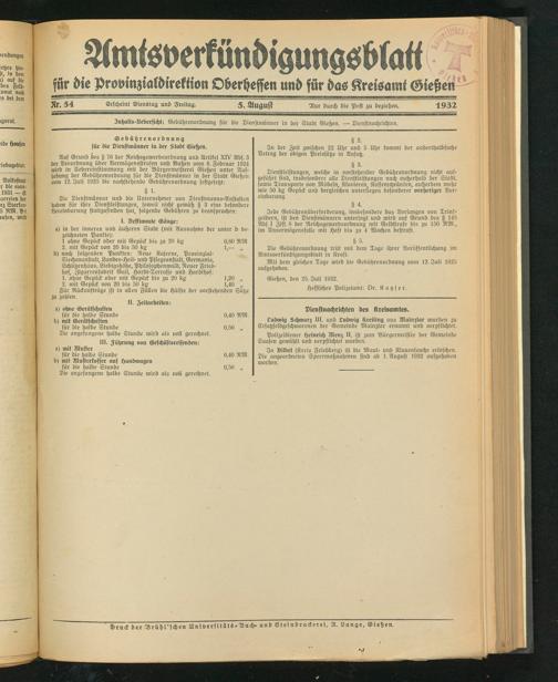 Amtsverkündigungsblatt für die Provinzialdirektion Oberhessen und der Kreisämter Gießen, Friedberg, Büdingen, Lauterbach, Schotten und Alsfeld. 1919-1937