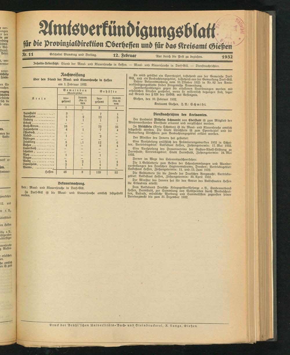 Amtsverkündigungsblatt für die Provinzialdirektion Oberhessen und der Kreisämter Gießen, Friedberg, Büdingen, Lauterbach, Schotten und Alsfeld. 1919-1937
