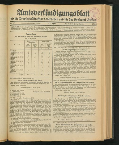 Amtsverkündigungsblatt für die Provinzialdirektion Oberhessen und der Kreisämter Gießen, Friedberg, Büdingen, Lauterbach, Schotten und Alsfeld. 1919-1937