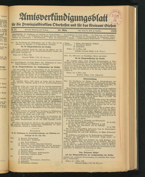 Amtsverkündigungsblatt für die Provinzialdirektion Oberhessen und der Kreisämter Gießen, Friedberg, Büdingen, Lauterbach, Schotten und Alsfeld. 1919-1937