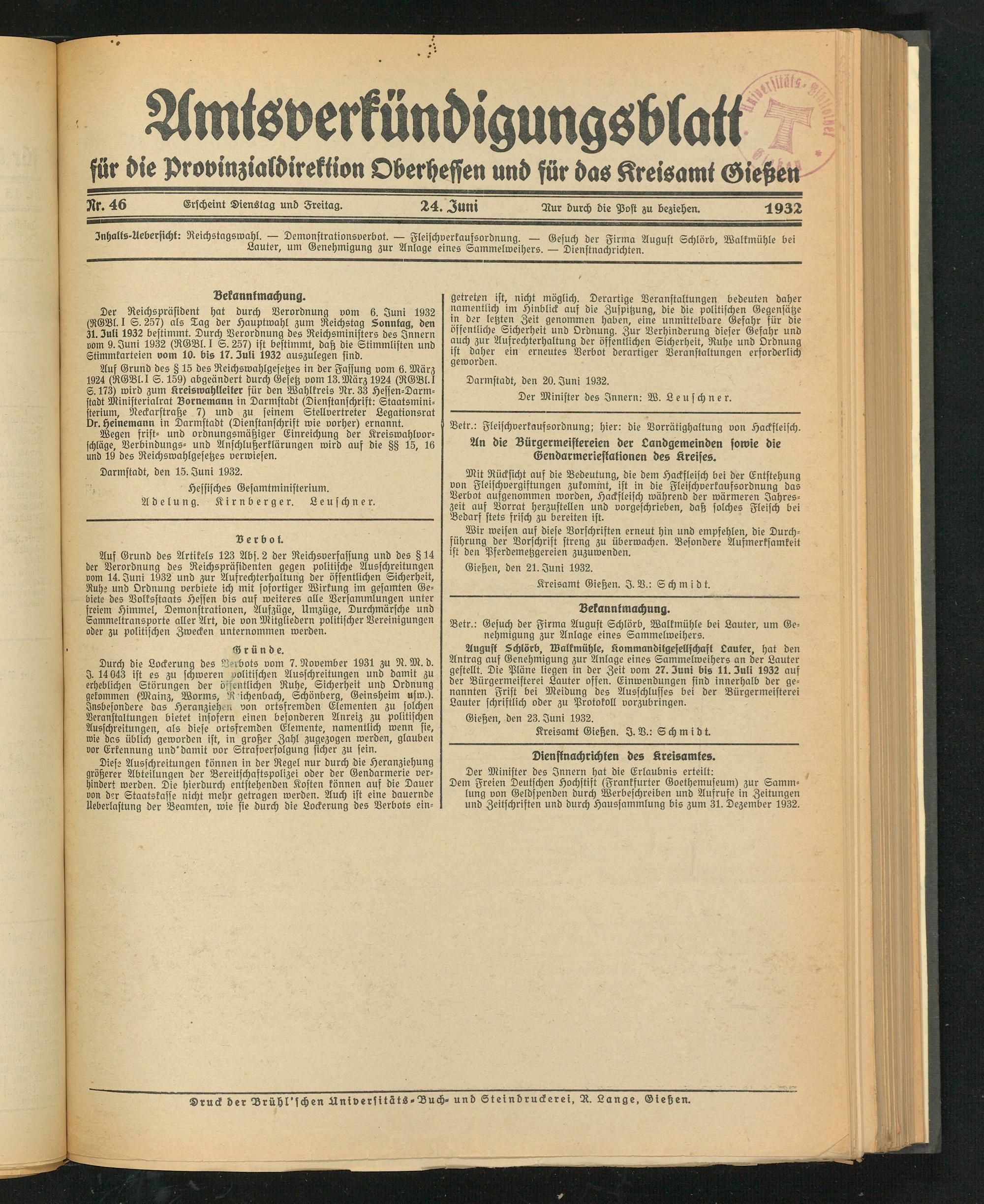 Amtsverkündigungsblatt für die Provinzialdirektion Oberhessen und der Kreisämter Gießen, Friedberg, Büdingen, Lauterbach, Schotten und Alsfeld. 1919-1937