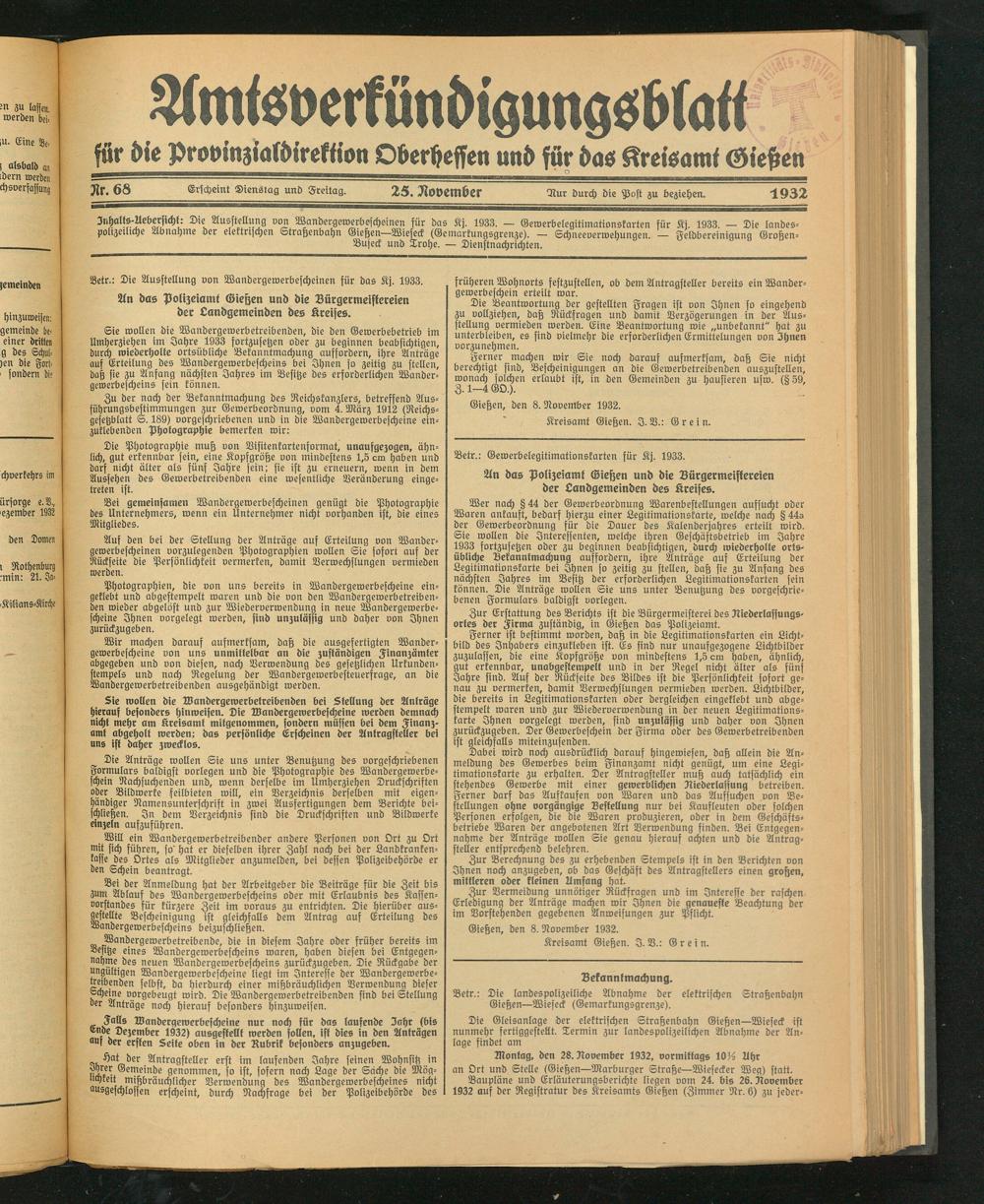 Amtsverkündigungsblatt für die Provinzialdirektion Oberhessen und der Kreisämter Gießen, Friedberg, Büdingen, Lauterbach, Schotten und Alsfeld. 1919-1937