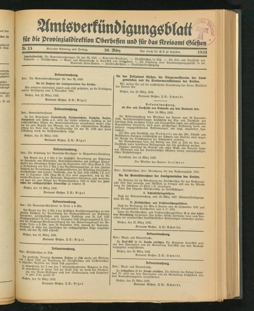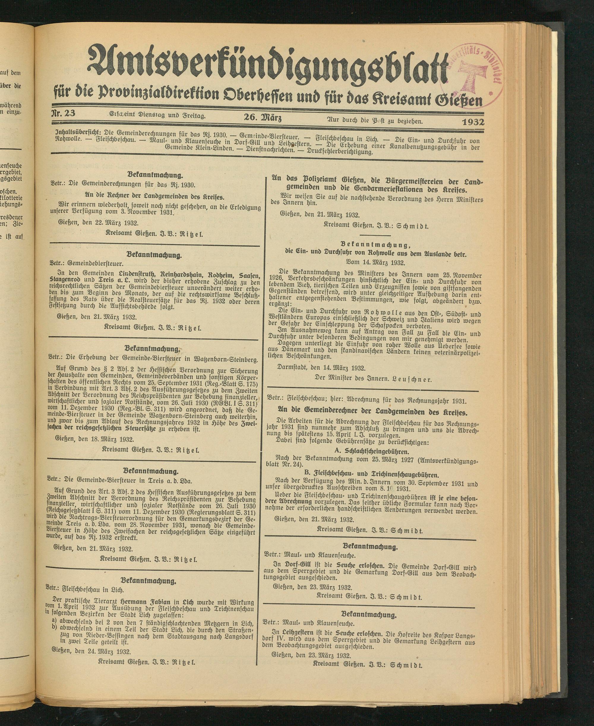 Amtsverkündigungsblatt für die Provinzialdirektion Oberhessen und der Kreisämter Gießen, Friedberg, Büdingen, Lauterbach, Schotten und Alsfeld. 1919-1937
