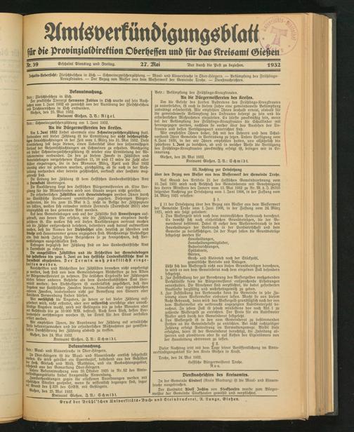 Amtsverkündigungsblatt für die Provinzialdirektion Oberhessen und der Kreisämter Gießen, Friedberg, Büdingen, Lauterbach, Schotten und Alsfeld. 1919-1937