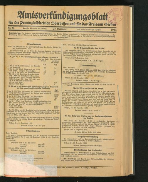 Amtsverkündigungsblatt für die Provinzialdirektion Oberhessen und der Kreisämter Gießen, Friedberg, Büdingen, Lauterbach, Schotten und Alsfeld. 1919-1937