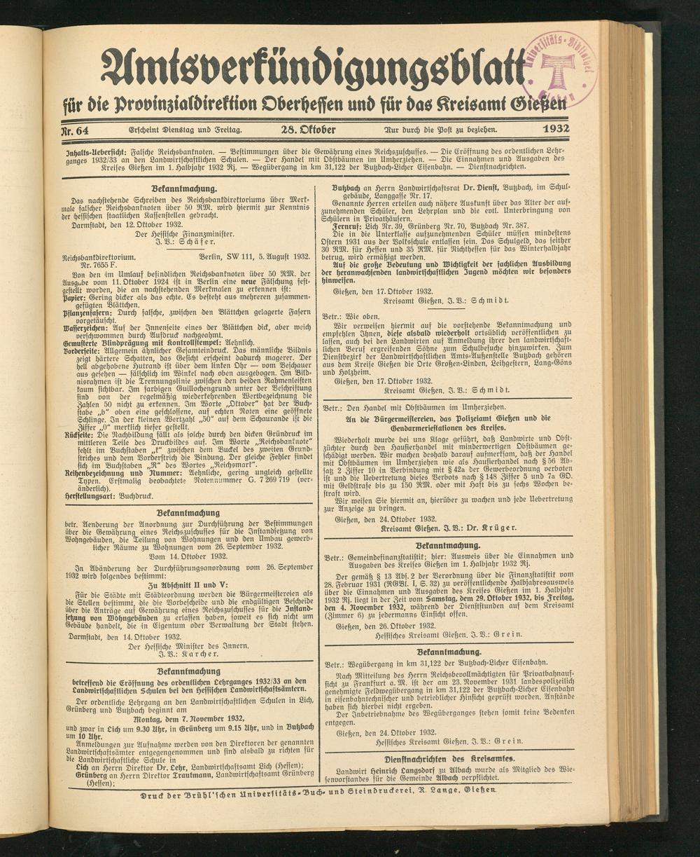 Amtsverkündigungsblatt für die Provinzialdirektion Oberhessen und der Kreisämter Gießen, Friedberg, Büdingen, Lauterbach, Schotten und Alsfeld. 1919-1937