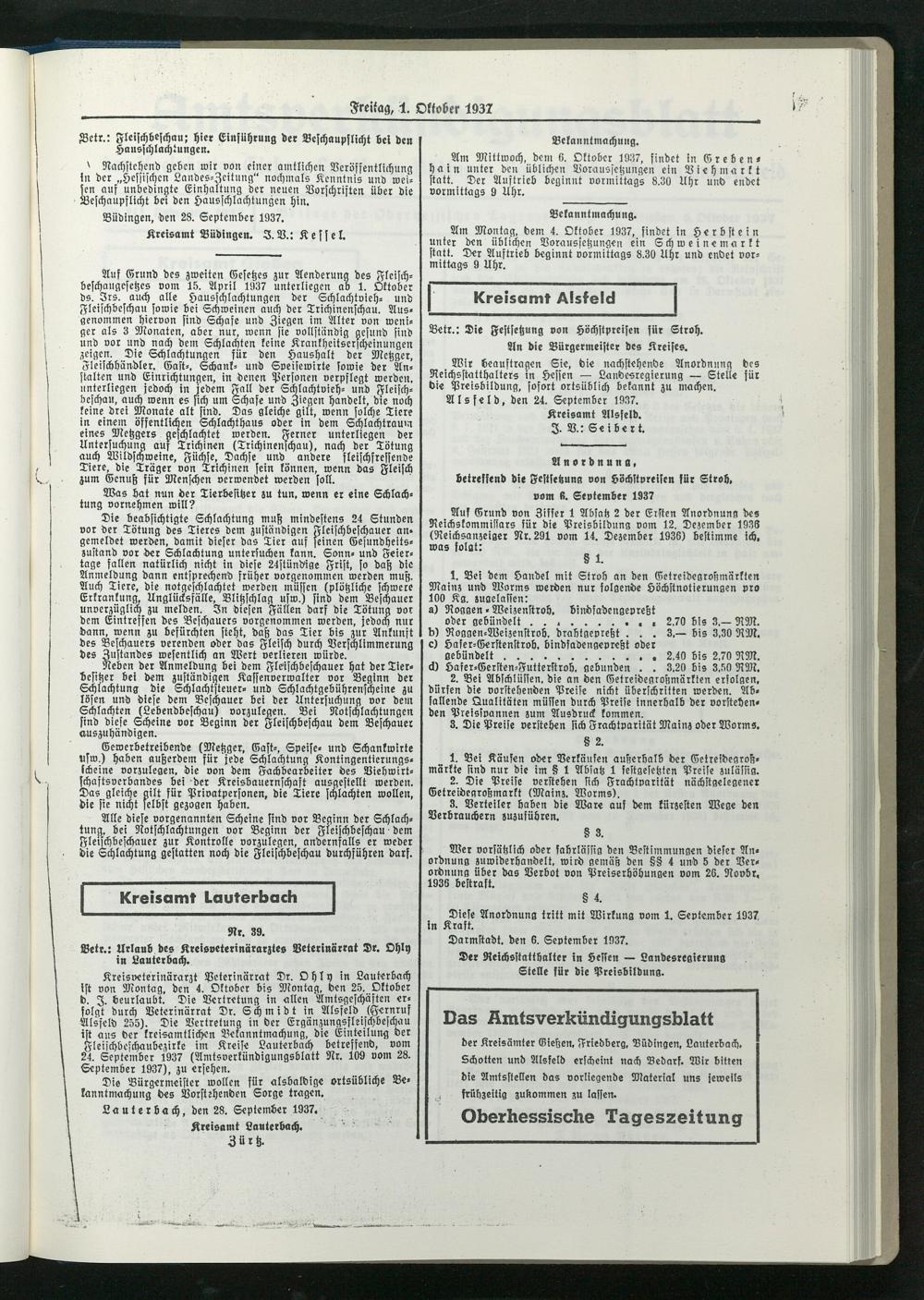 Amtsverkündigungsblatt der Landkreise Gießen, Friedberg, Büdingen, Lauterbach und Alsfeld. 1937-1939
