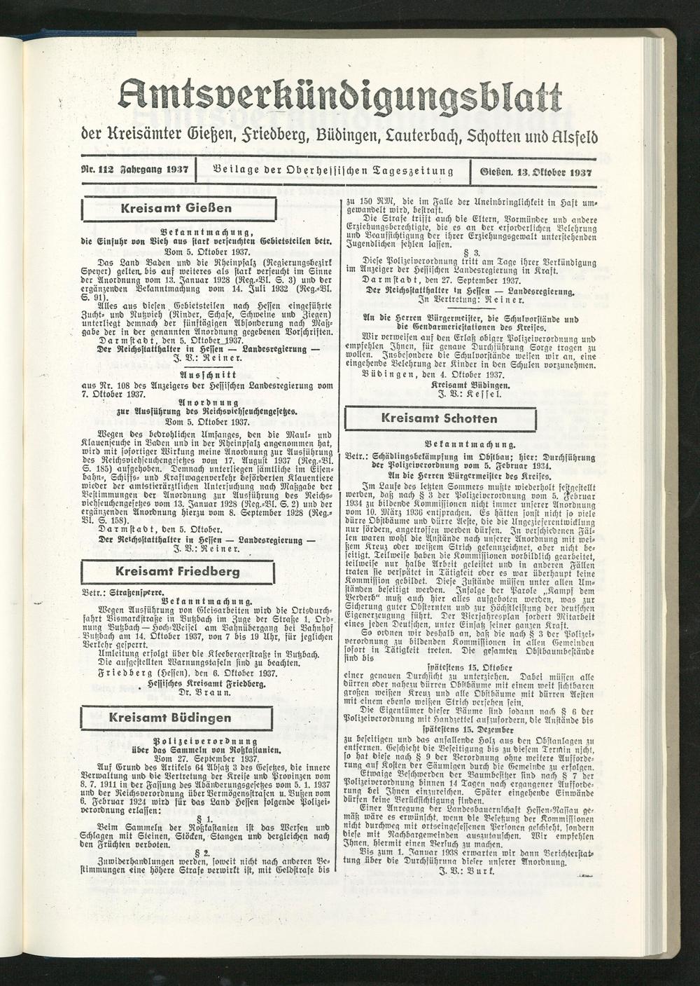 Amtsverkündigungsblatt der Landkreise Gießen, Friedberg, Büdingen, Lauterbach und Alsfeld. 1937-1939
