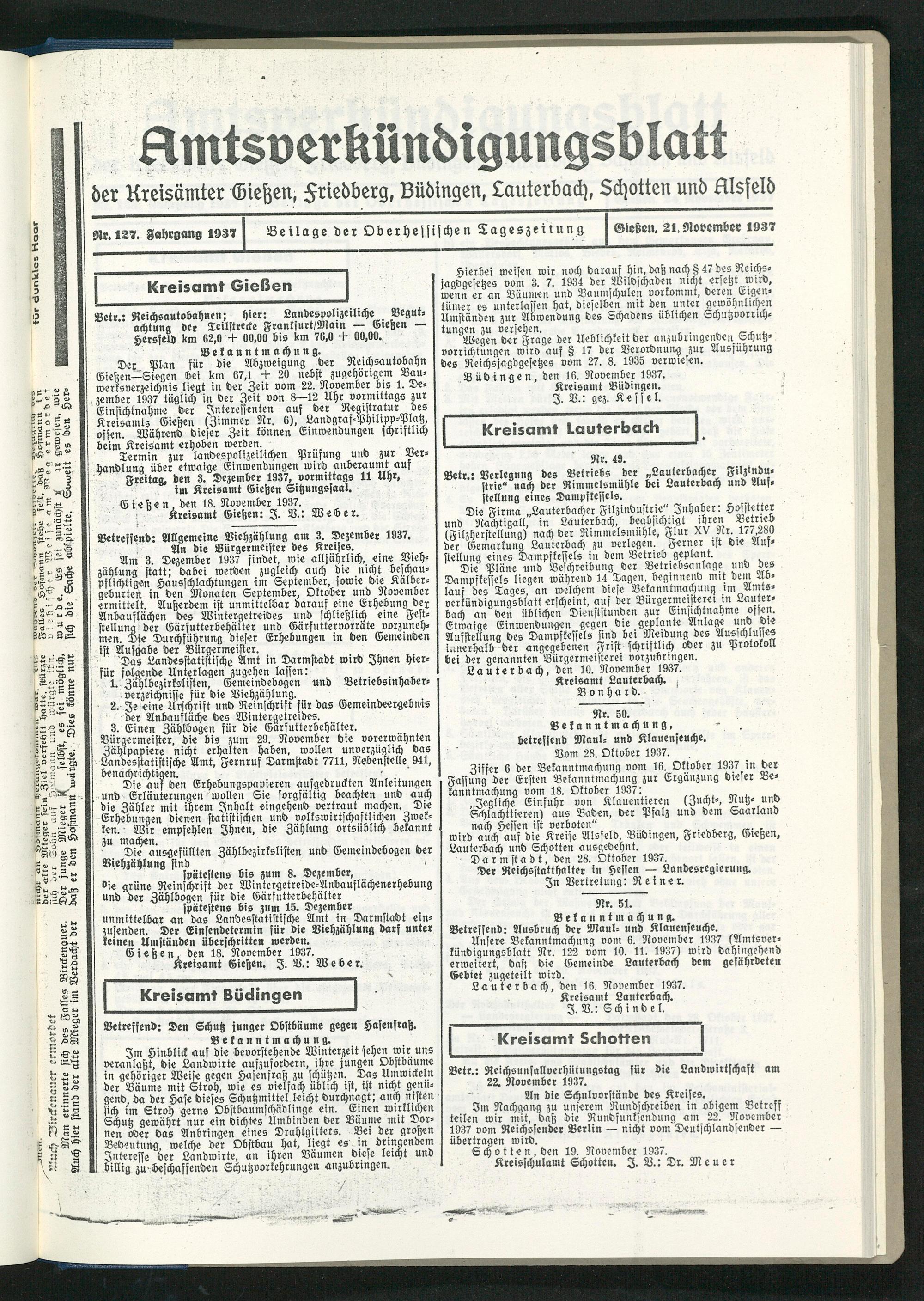 Amtsverkündigungsblatt der Landkreise Gießen, Friedberg, Büdingen, Lauterbach und Alsfeld. 1937-1939