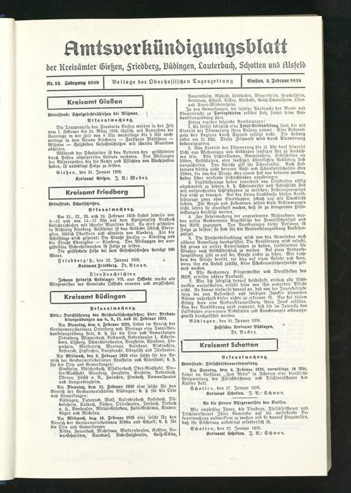 Amtsverkündigungsblatt der Landkreise Gießen, Friedberg, Büdingen, Lauterbach und Alsfeld. 1937-1939