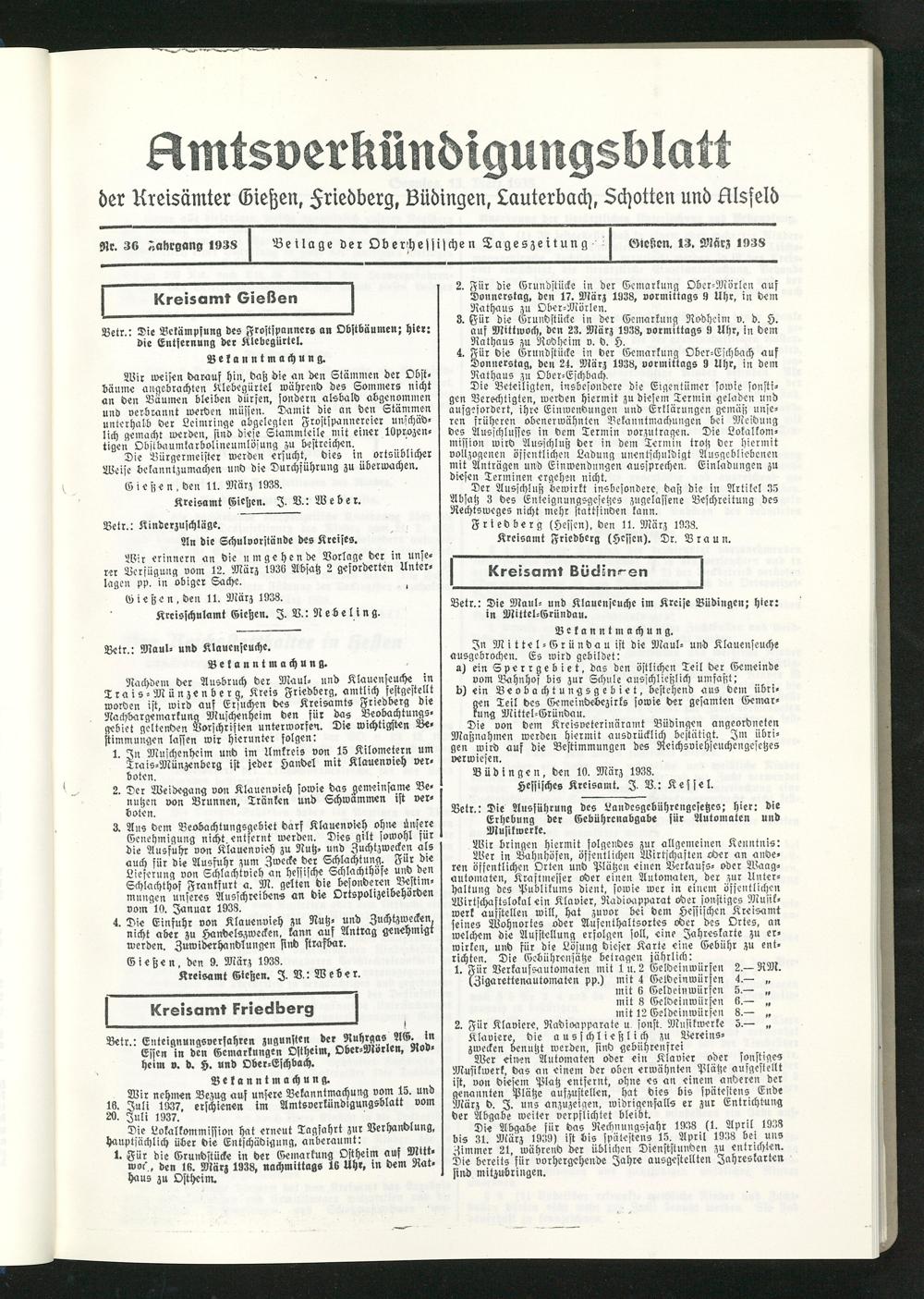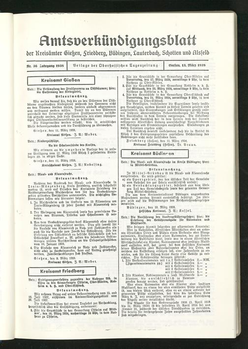 Amtsverkündigungsblatt der Landkreise Gießen, Friedberg, Büdingen, Lauterbach und Alsfeld. 1937-1939