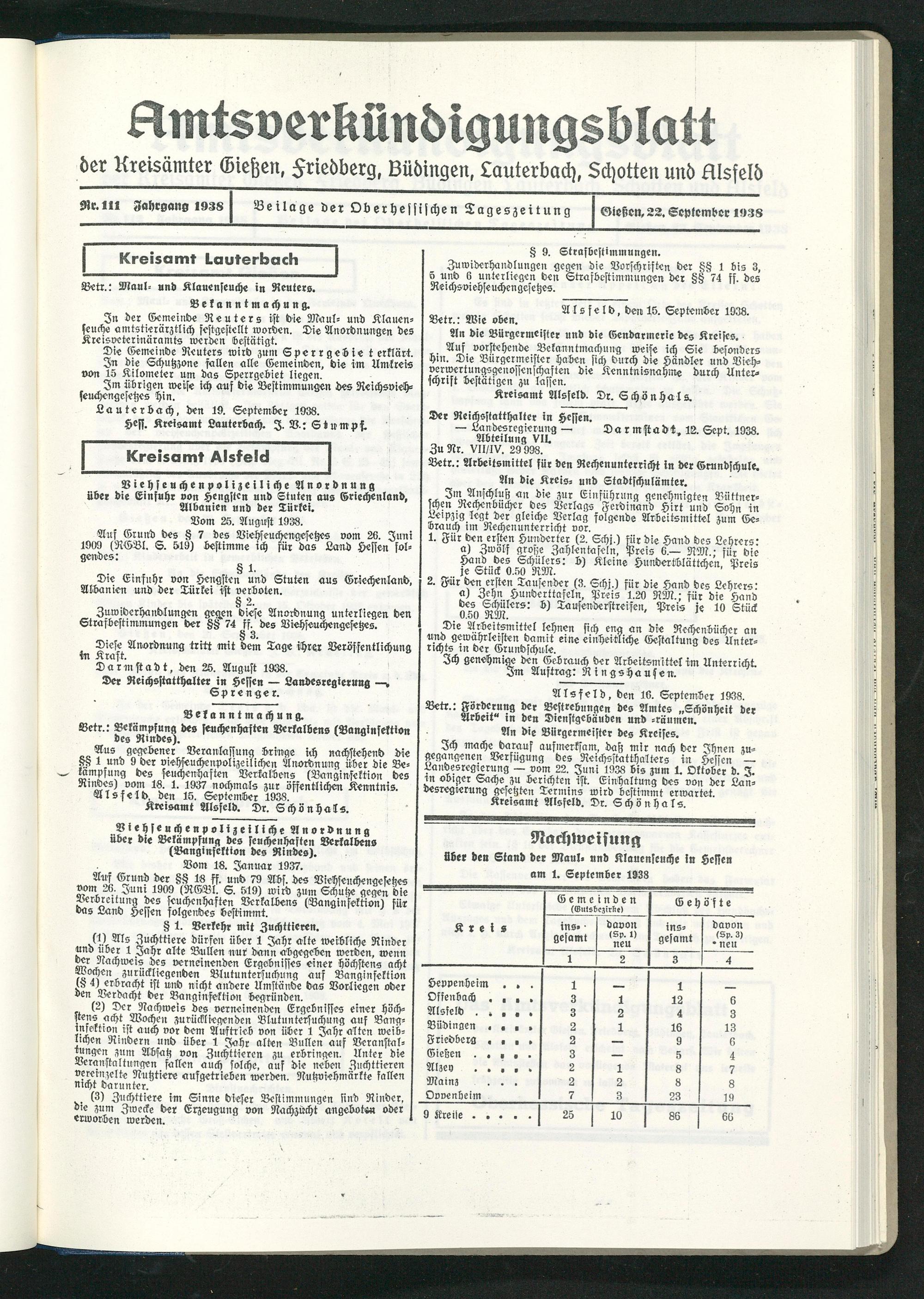 Amtsverkündigungsblatt der Landkreise Gießen, Friedberg, Büdingen, Lauterbach und Alsfeld. 1937-1939