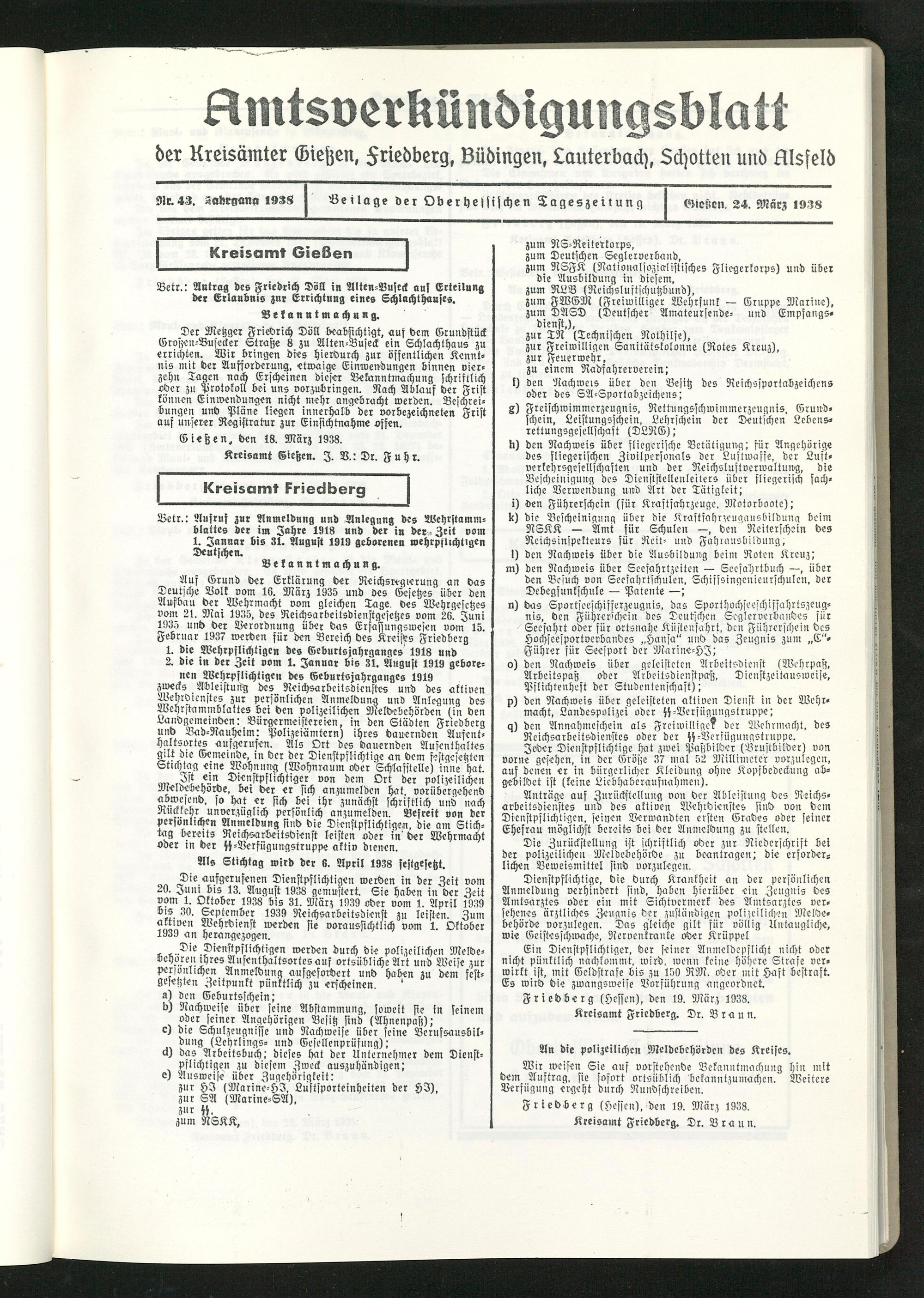 Amtsverkündigungsblatt der Landkreise Gießen, Friedberg, Büdingen, Lauterbach und Alsfeld. 1937-1939