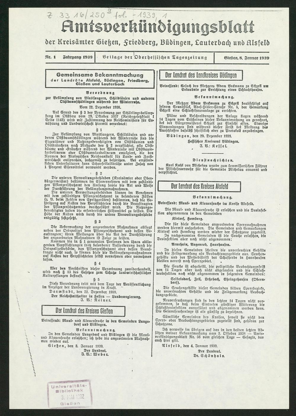 Amtsverkündigungsblatt der Landkreise Gießen, Friedberg, Büdingen, Lauterbach und Alsfeld. 1937-1939