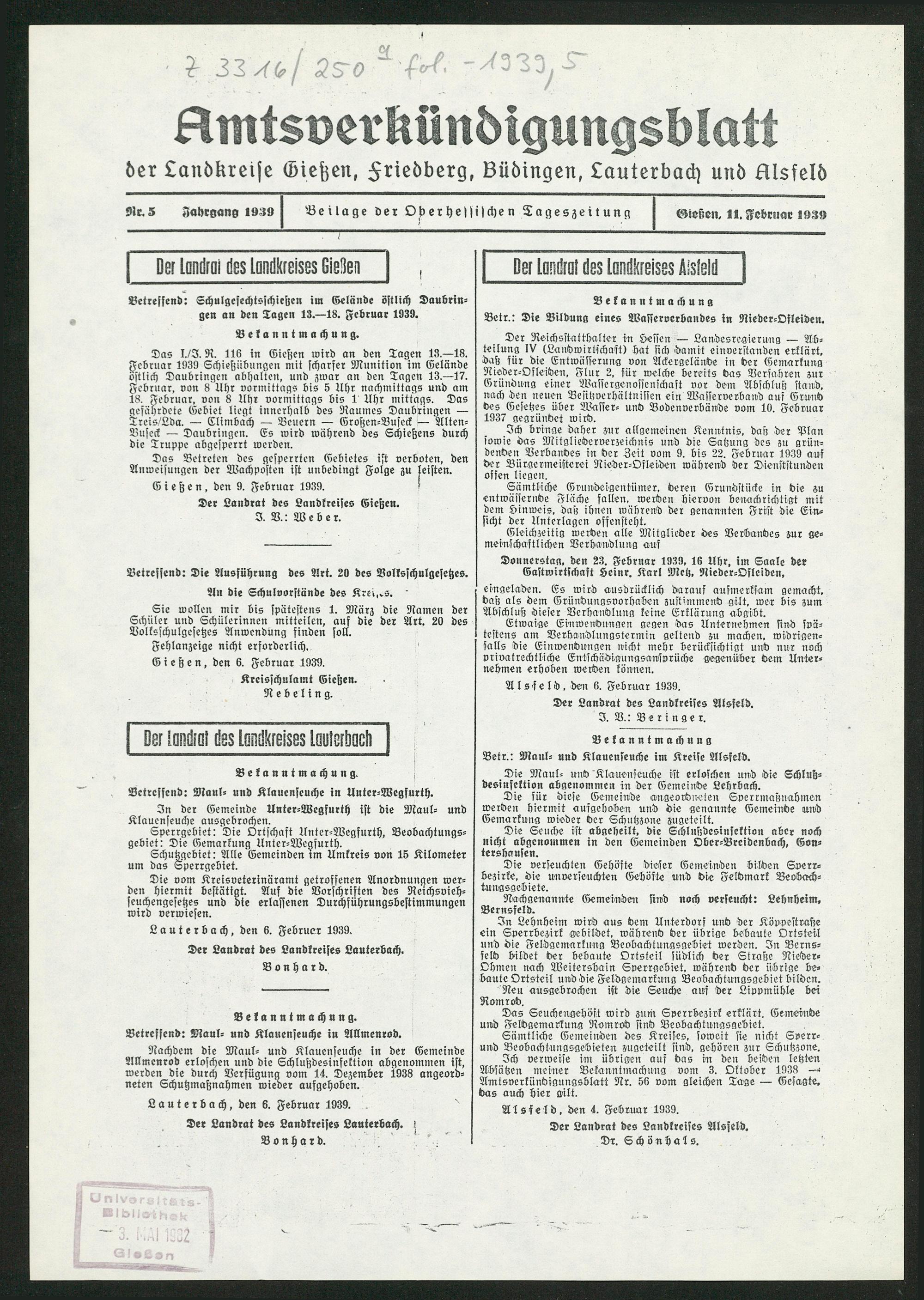 Amtsverkündigungsblatt der Landkreise Gießen, Friedberg, Büdingen, Lauterbach und Alsfeld. 1937-1939