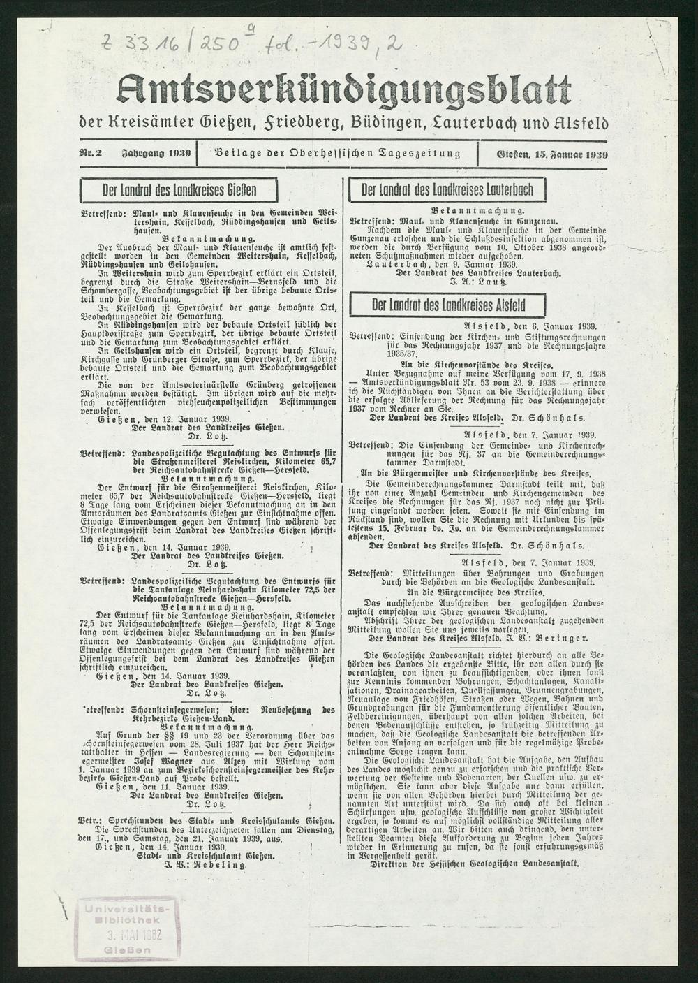 Amtsverkündigungsblatt der Landkreise Gießen, Friedberg, Büdingen, Lauterbach und Alsfeld. 1937-1939