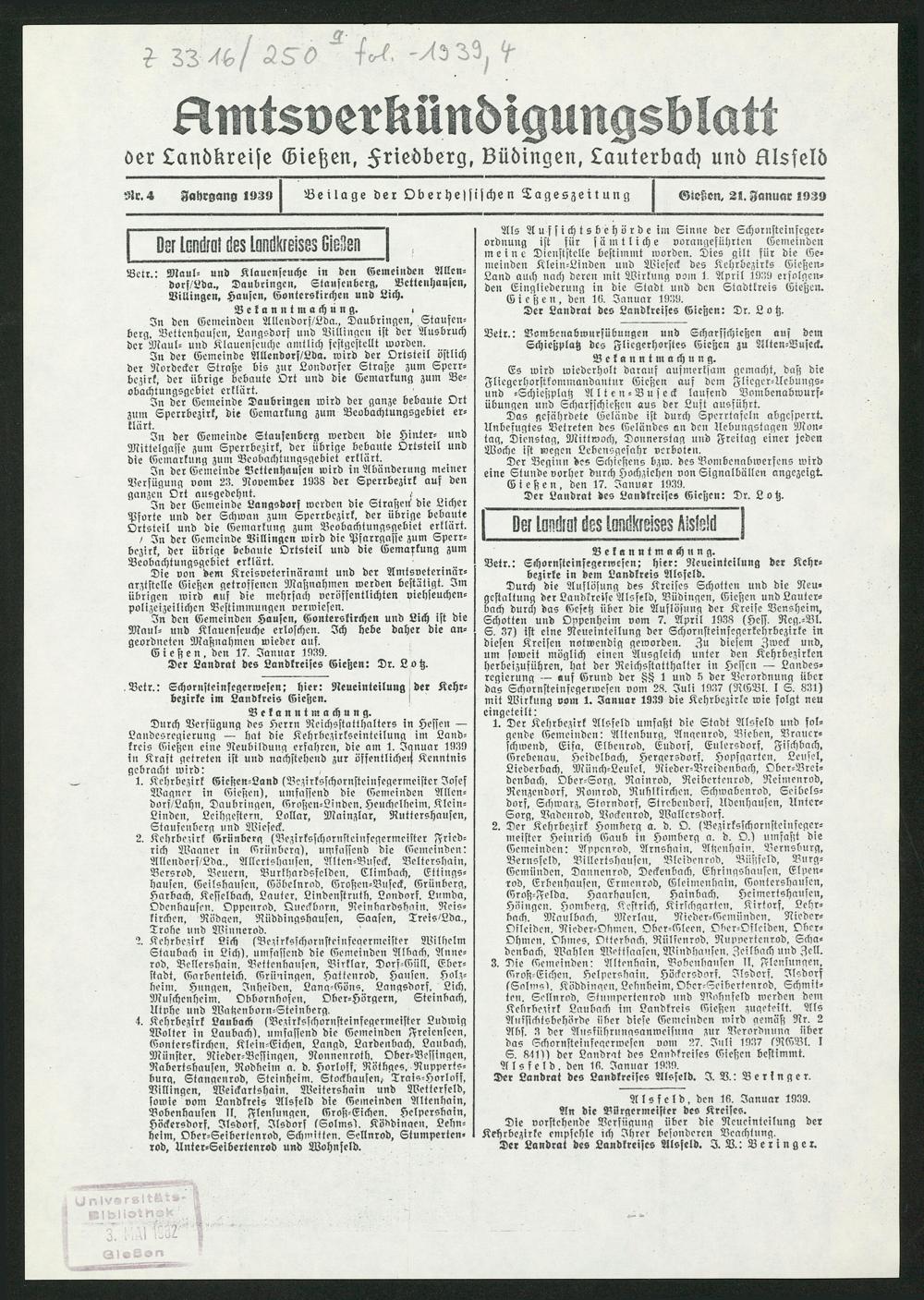 Amtsverkündigungsblatt der Landkreise Gießen, Friedberg, Büdingen, Lauterbach und Alsfeld. 1937-1939