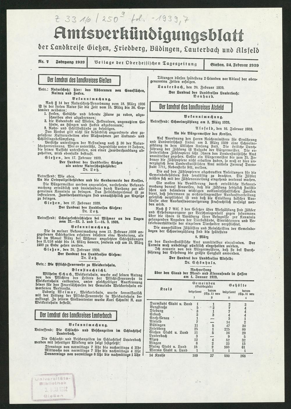 Amtsverkündigungsblatt der Landkreise Gießen, Friedberg, Büdingen, Lauterbach und Alsfeld. 1937-1939