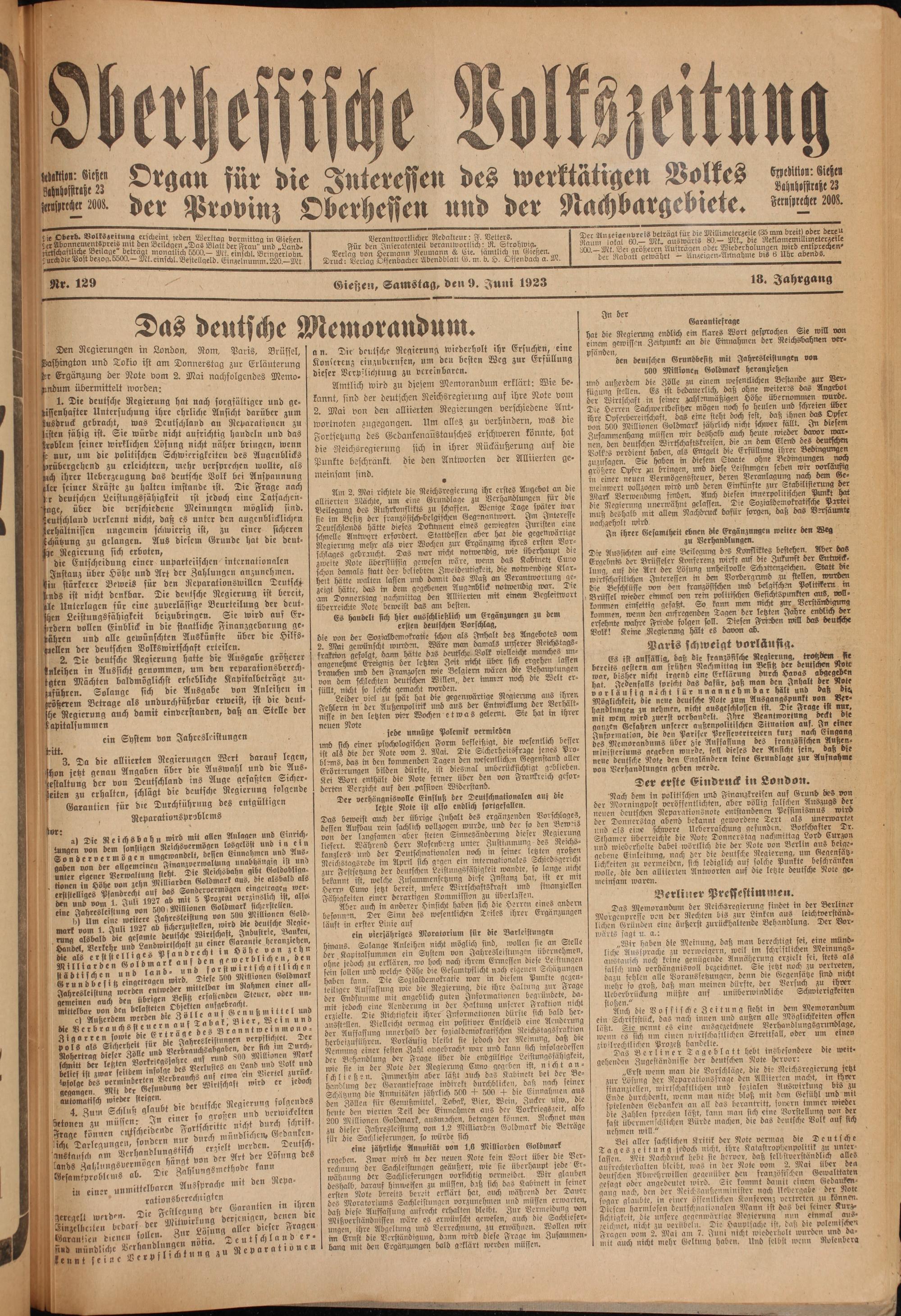 Oberhessische Volkszeitung. 1914-1923