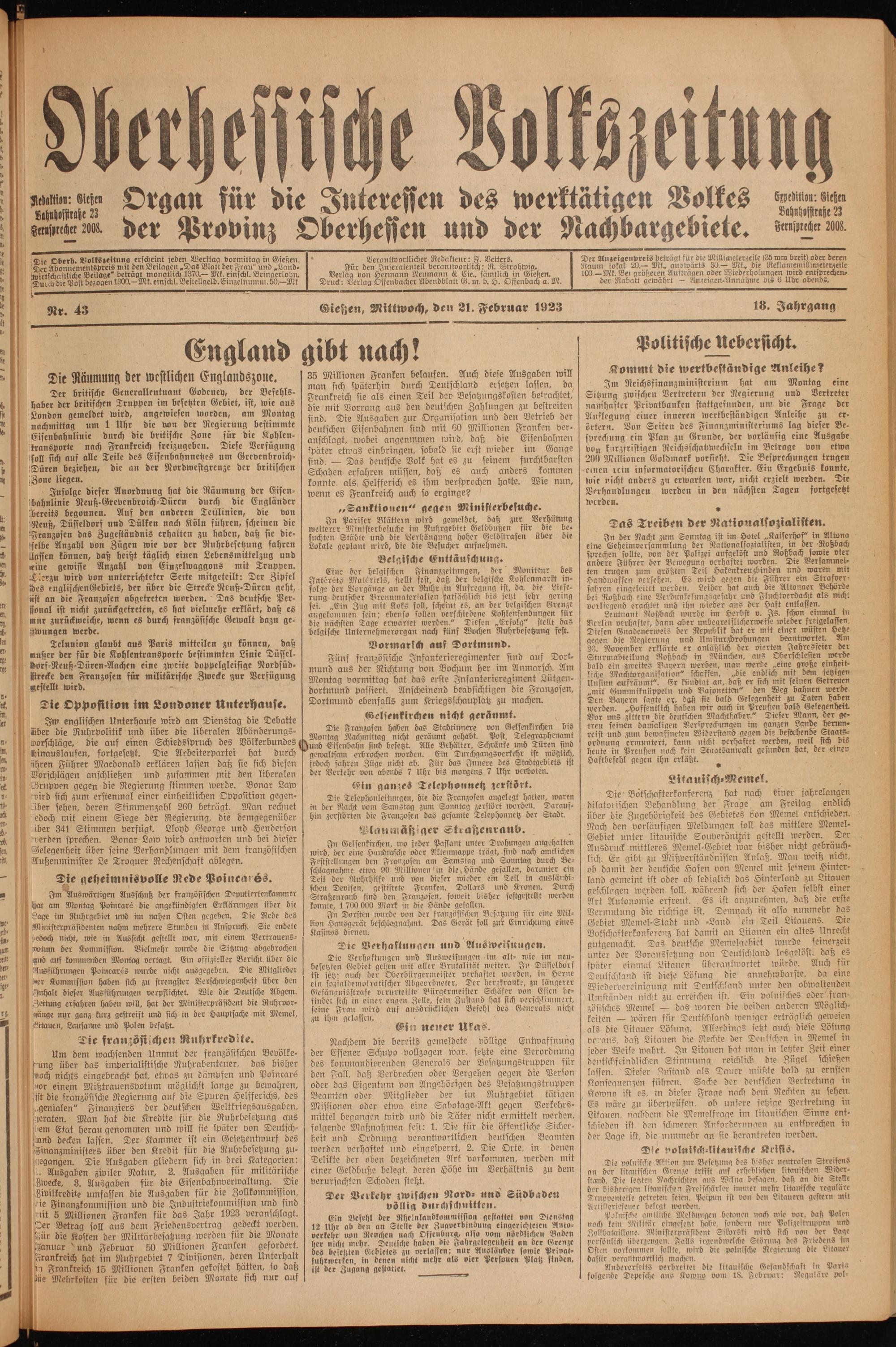 Oberhessische Volkszeitung. 1914-1923