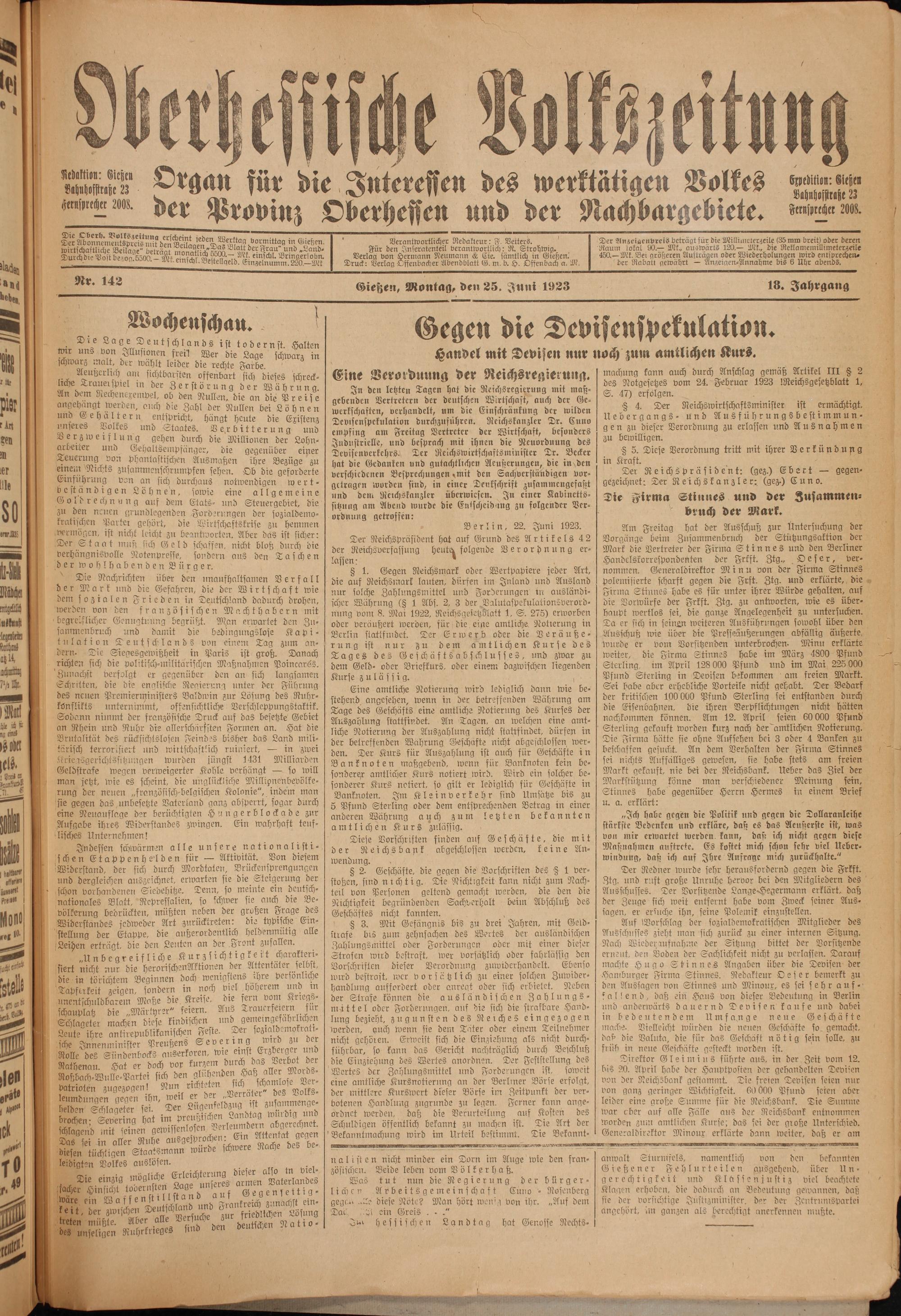 Oberhessische Volkszeitung. 1914-1923