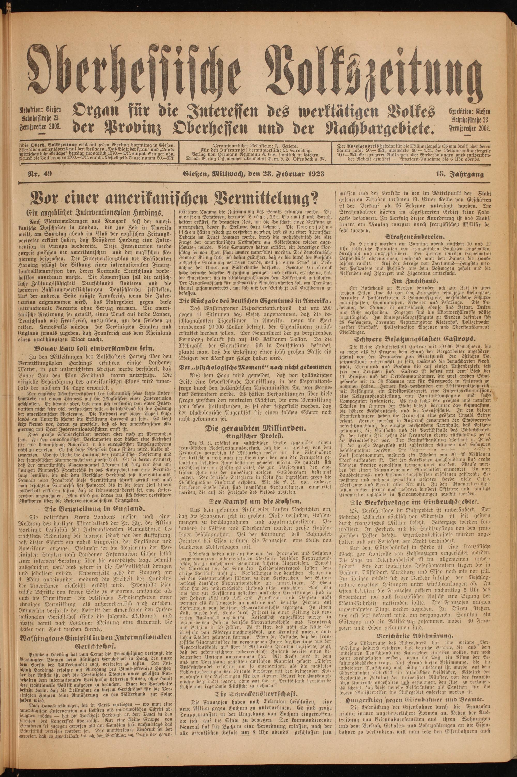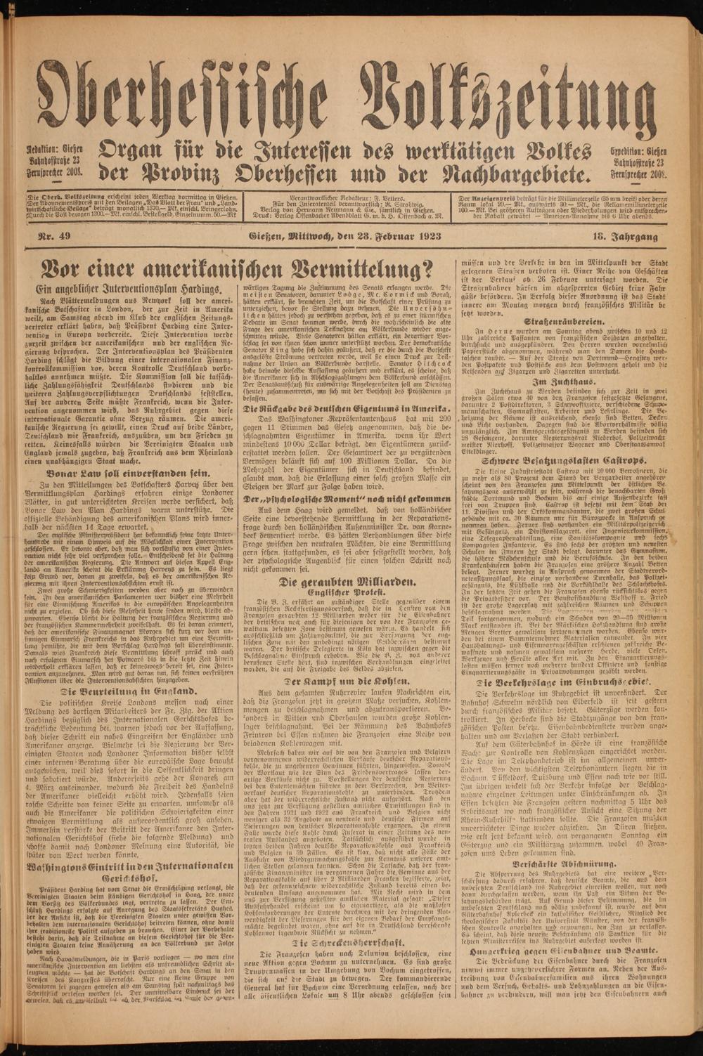 Oberhessische Volkszeitung. 1914-1923