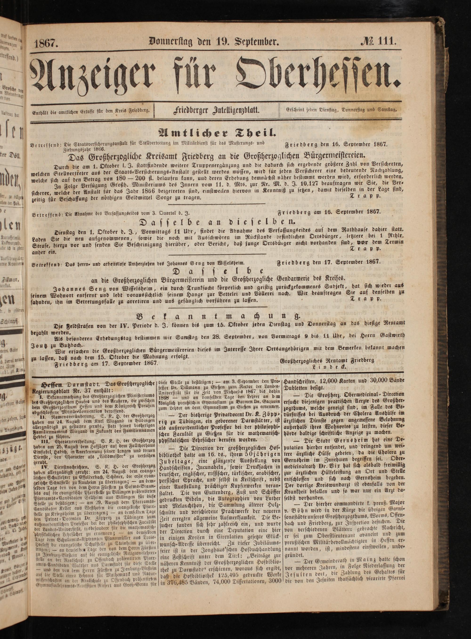 Anzeiger für Oberhessen. 1866-1868