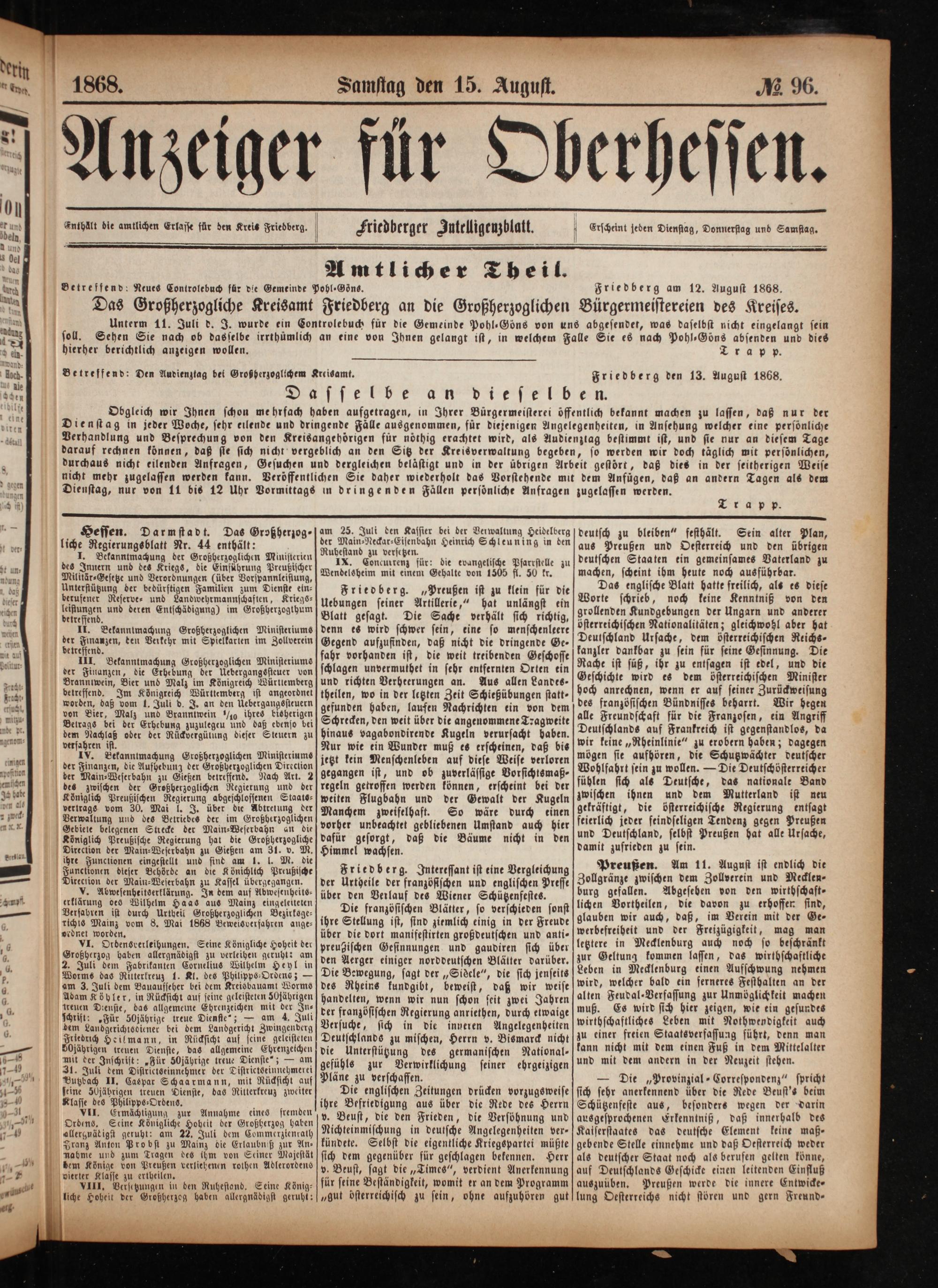 Anzeiger für Oberhessen. 1866-1868