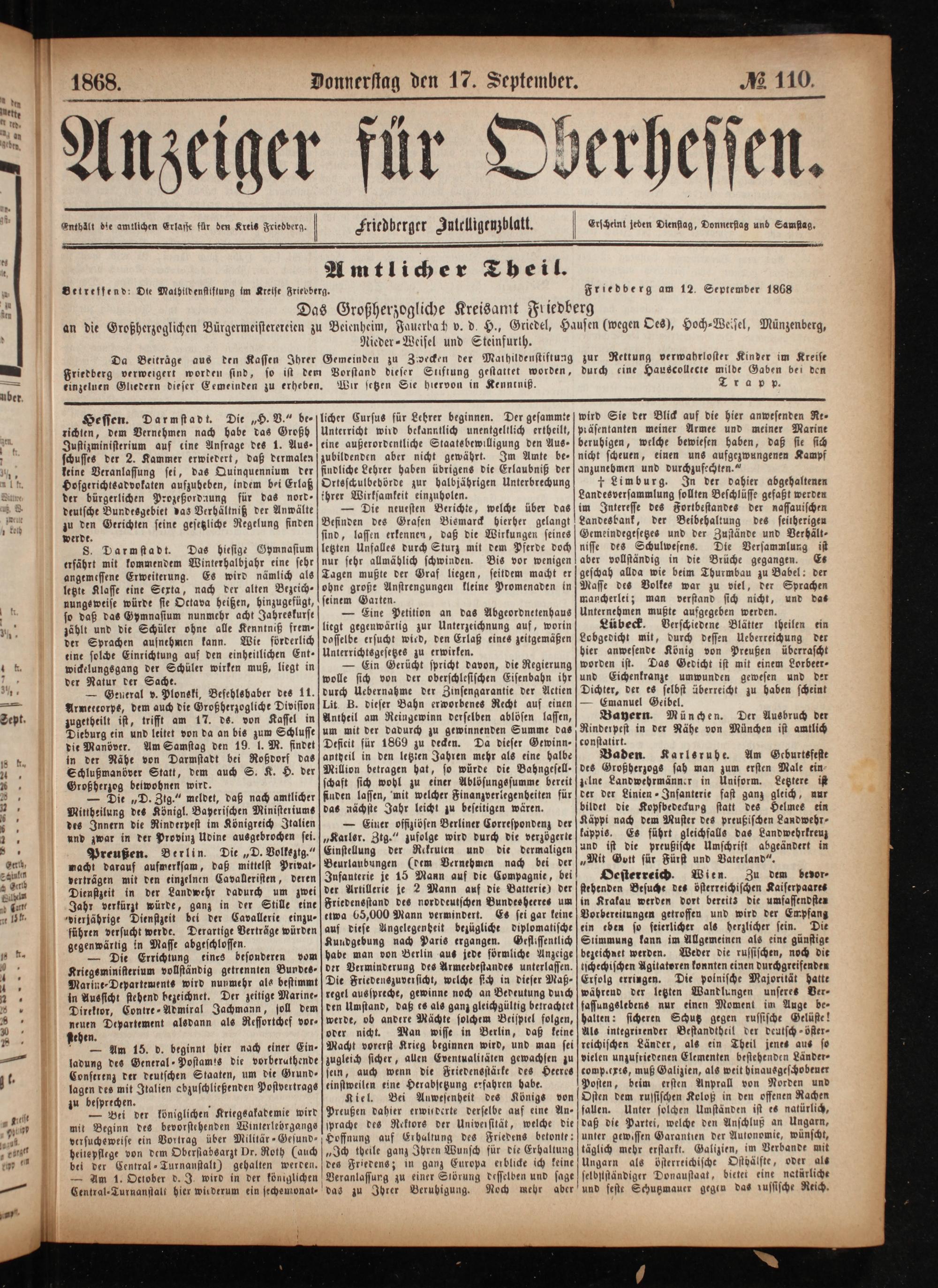 Anzeiger für Oberhessen. 1866-1868