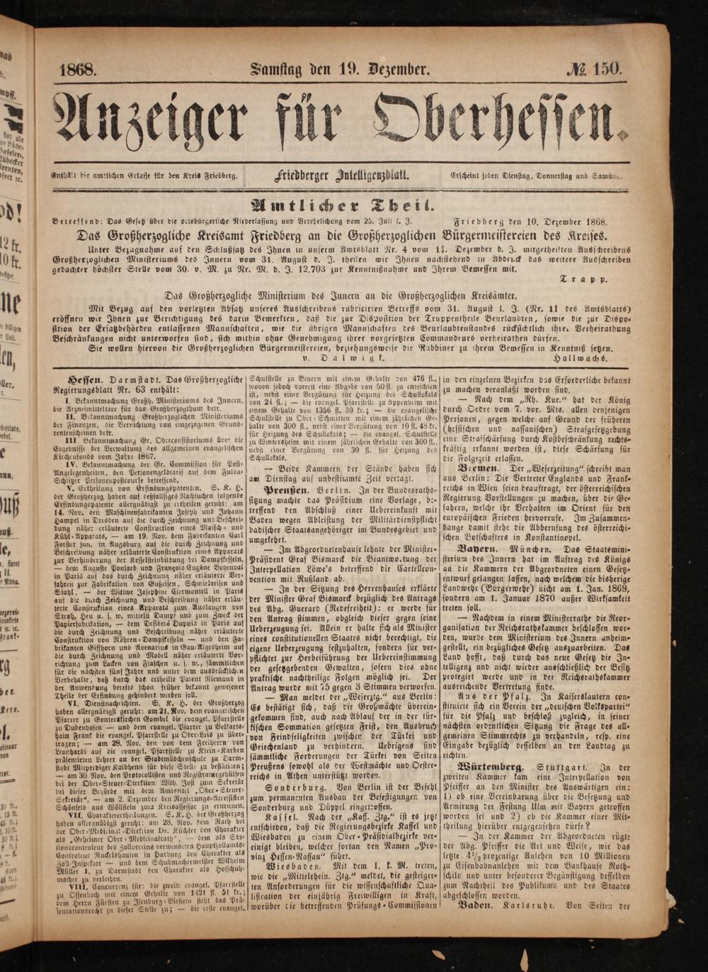 Anzeiger für Oberhessen. 1866-1868