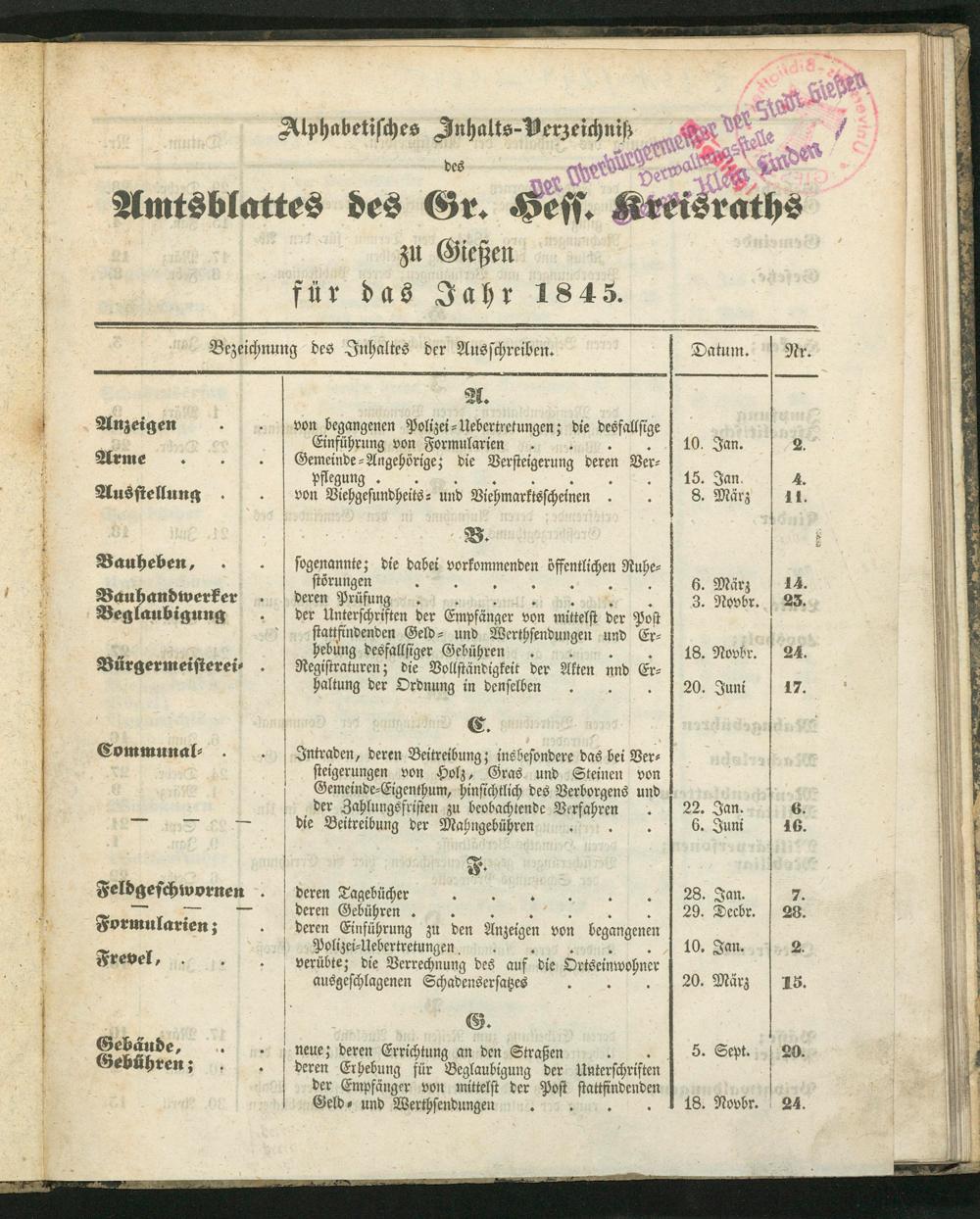 (29.12.1845) Inhaltsverzeichnis