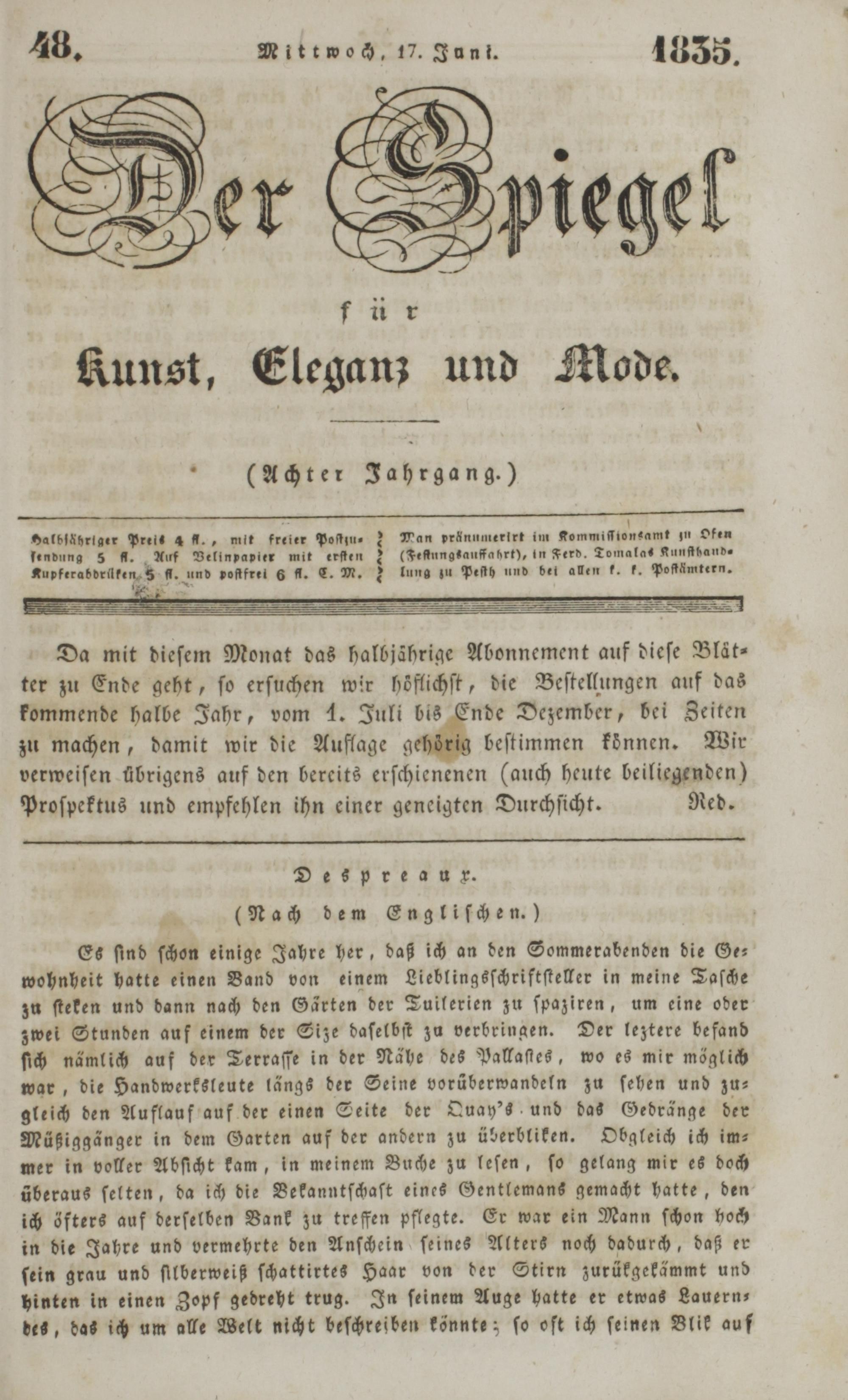 Der Spiegel für Kunst, Eleganz und Mode. 1835-1840