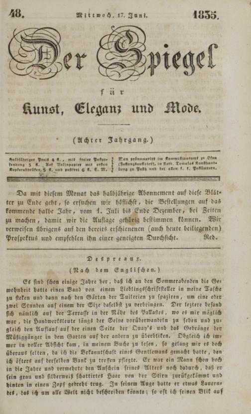 Der Spiegel für Kunst, Eleganz und Mode. 1835-1840