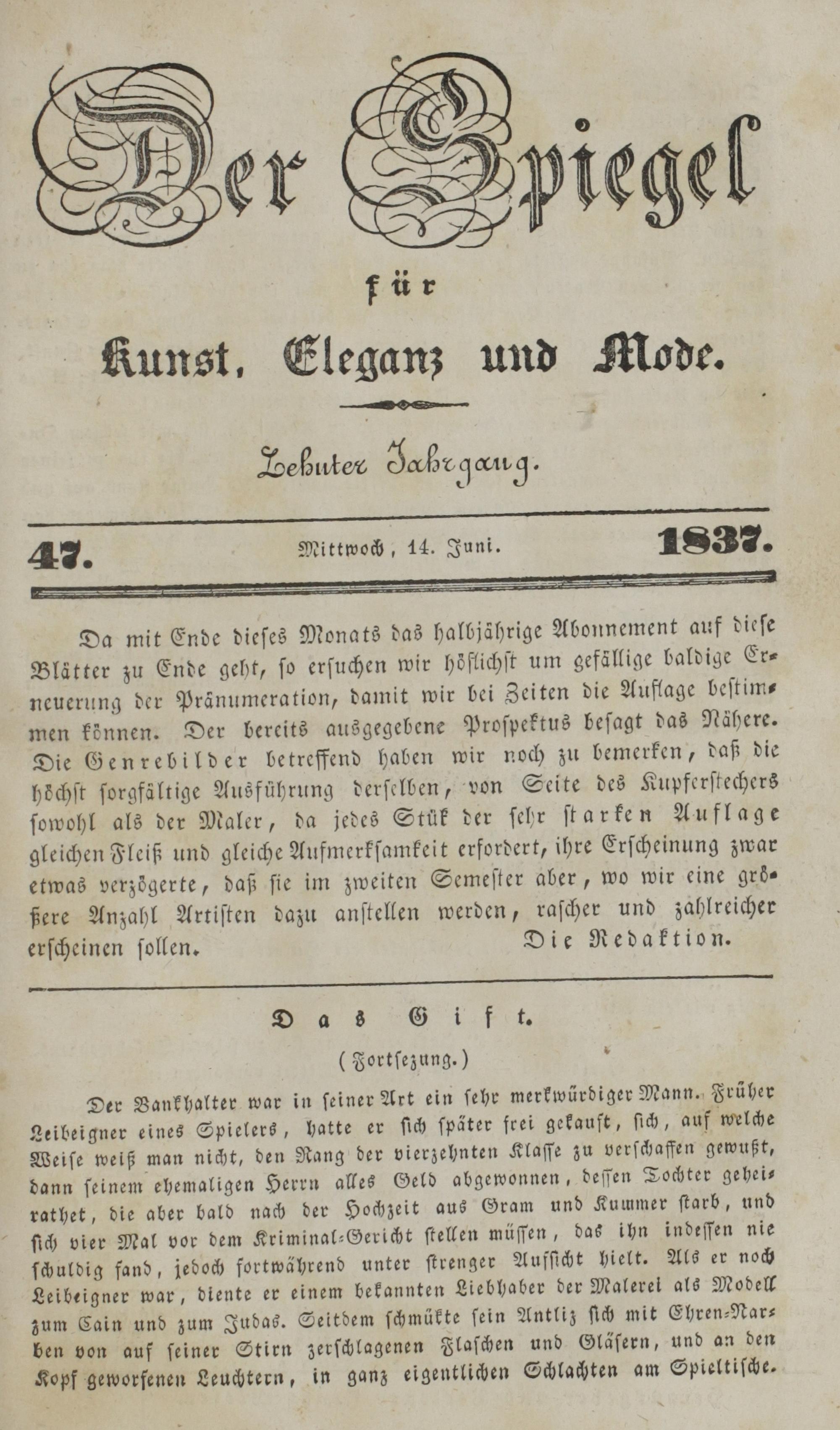 Der Spiegel für Kunst, Eleganz und Mode. 1835-1840
