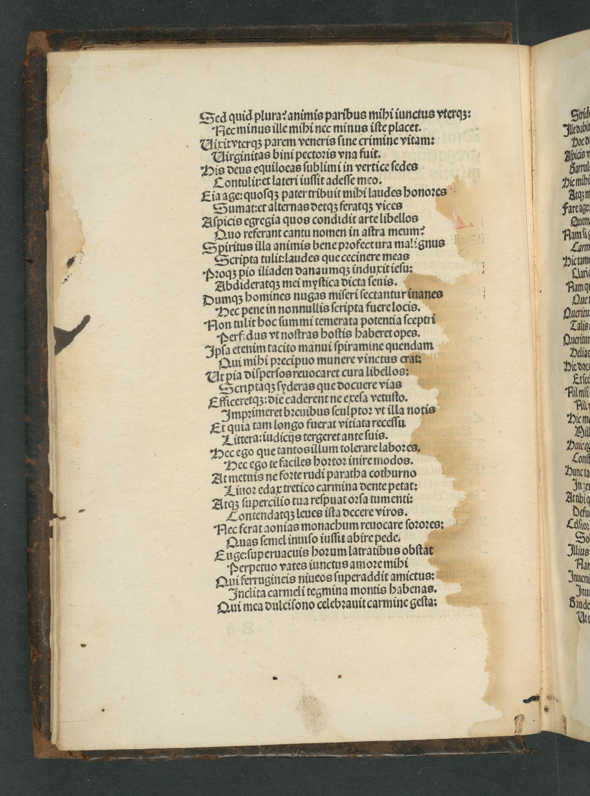 Piec minus ille mihi nec minus iſte placet. Vixitvterqʒ parem veneris ſine crimine vitam: Virginitas bini pectoꝛis vna fuit. His deus equiloeas ſublimi in vertice ſedes Contulitet lateri inſſit adeſſe meo. Eiaage: quoſqʒ patertribuit mihi laudes honoꝛes Sumat:et alternas detaʒ feratqʒ vices Zſpicis egregia quos condidit arte libellos uo referant cantu nomen in aſtra meum Spiritus illa animis bene pꝛofectura malignus Scripta tulit:laudes que cecinere meas oꝛoqʒ pio iliaden danaumqʒ induxit ieſu: Abdideratqʒ mei myſtica dicta ſenis. umqʒ homines nugas miſeri ſectanturinanes BHec pene in nonmillis ſcripta fuere locis. Pon tulit hoc ſummi temerata polentiaſ ceptri Perfidus vt noſtras hoſtis haberetopes. Ipha etenimtacito manui ſpiramine quendam Qui mihi pꝛecipuo munere vinctus erat tꝑia diſperſos reuocaret cura libellos: Scnptaqʒ ſyderas que docuere vias Eiceretqʒ: die caderent ne exeſa vetuſto. mpꝛimeret bꝛeuibus ſculptoꝛ vt illa notis Eẽquia tam longo fuerat vitiata receſſu Littera:iudicijs tergeret ante ſuis. Hec ego que tantosillum tolerare laboꝛes. Bec ego te faciles hoꝛtoꝛ inire modos. Ztmetnis ne foꝛte rudi paratha cothurno Linoꝛ edax tretico carmina dente petat: Ztqʒ ſupercilio tua reſpuat oꝛſa tumenti: Zoniendatqʒ leues iſta decere viros. Pec ferat aonias monachum reuocare ſoꝛoꝛes uas ſemel imnſo iuſſit abire pede Eugeſuperuacuis hoꝛum latratibus obſtat Perpetuo vates iuncius amoꝛemihi Quiferrugineis niueos ſuperaddit amictus: Inclita carmeli tegmina monis habenas. Qui mea dulciſono celebꝛauit carmine geſta: