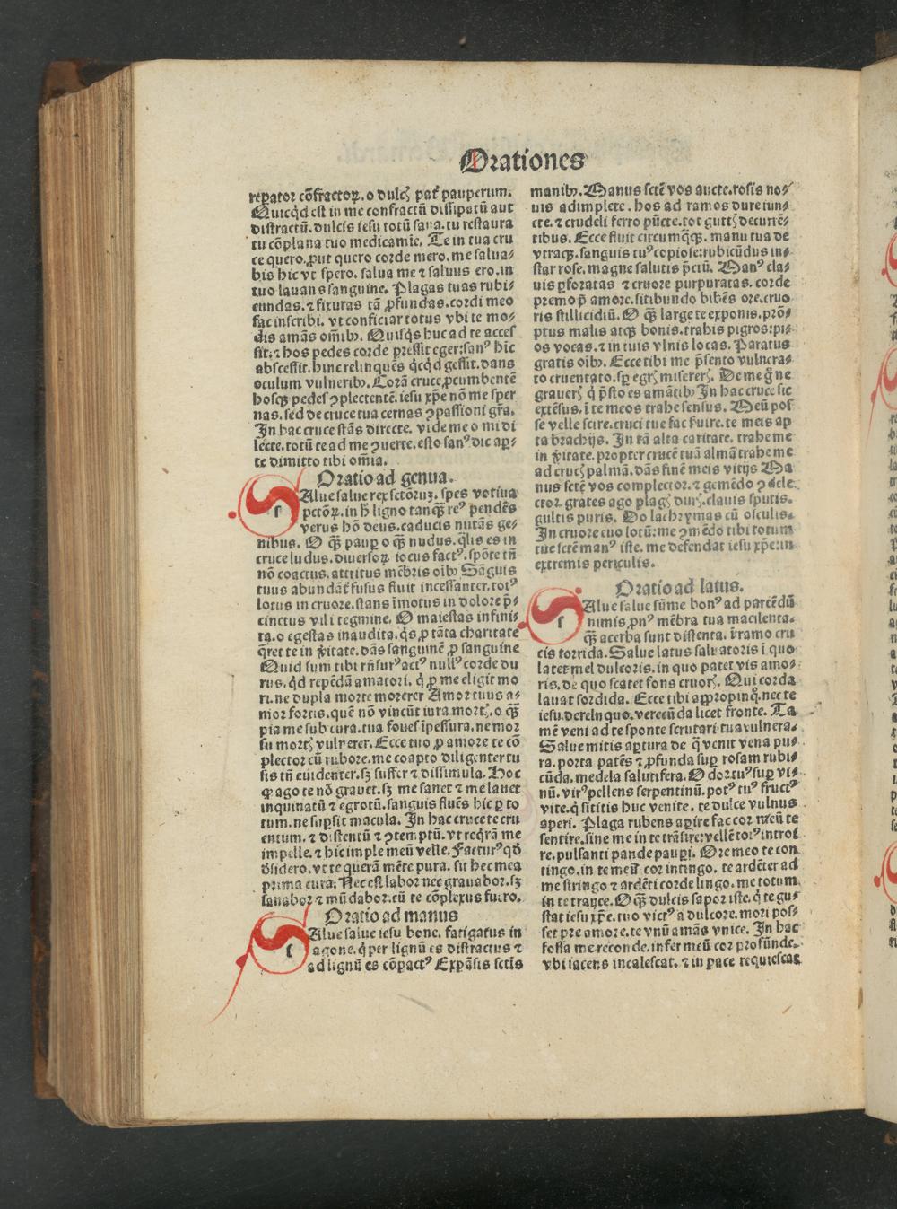 vtraq;.ſanguis tuꝰcepioſe:rubicũdus ins ſtar roſe. magne ſalutis pᷣciũ. Wanꝰ cla⸗ uis ꝑfoꝛatas ⁊ cruoꝛe purpuratas.coꝛde pꝛemopᷓ ameꝛe.ſitibundo bibẽs oꝛe.cruo ris ſullicidiũ. O qᷓ; large te exponis.pꝛð⸗ ptus malis atq; bonis.trahis pigros:pis