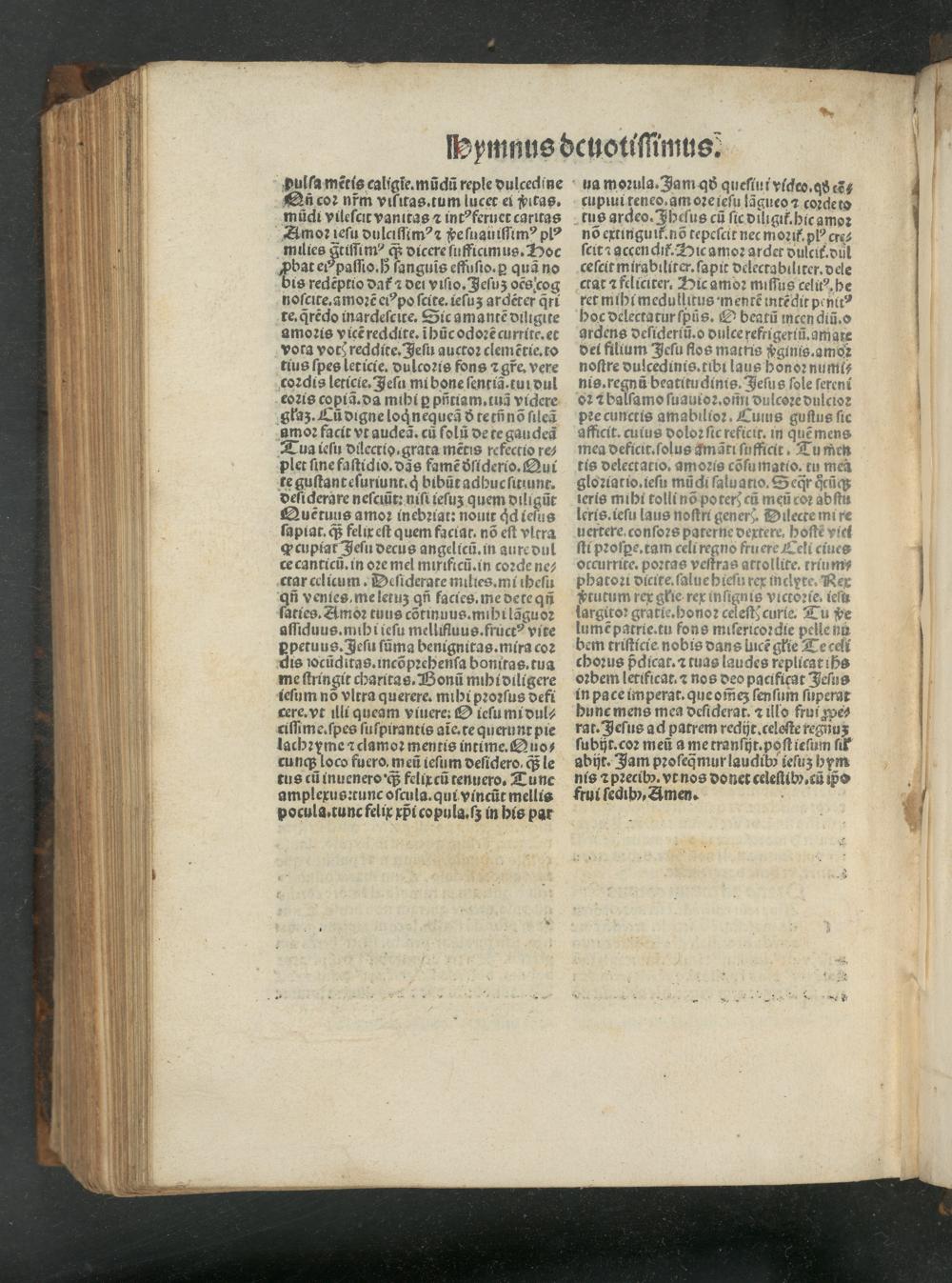 nõ extinguit᷑nõ tepeſcit nec moꝛit᷑ płꝰ cre⸗ ſcit ⁊ qccendit᷑. Hic amoꝛ ardet dulcit.dul ceſcit mirabiliter.ſapit delectabiliter. dele ctat ⁊ feliciter. Hic amdꝛ miſſus celiꝰ. he ret mihi medullitus mentẽ intẽdit penitꝰ hoc delectatur ſpũs. E beatũ incen diũ.o ordens deſideriũ.o dulce refrigeriũ.amare dei filium Jeſu flos matris vginis. amoꝛ noſtre dulcedinis.tibi laus honoꝛ numl⸗ nis.regnũ beatitudinis. Jeſus ſole ſereni oꝛ ⁊ balſamo ſuauioꝛ.oſin dulcoꝛe dulcioꝛ pꝛe cunctis amabilioꝛ. Cumus guſtus ſic afficit. cuius doloꝛ ſic reficit.in quẽ mens mea deficit.ſolus qmãti ſufficit Tum̃en tis delectatio. amoꝛis cõſu matio. tu mea gloꝛiatio.ieſu mũdi ſaluatio. S eq̃r ͥcũq; teris mihi tolli nõ poterꝰ cũ meñ coꝛ abſtu leris.ieſu laus noſtri geners. Dilecte mi re uertere conſoꝛs paterne dextere. hoſtẽ viei ſti pꝛoſpe.tam celi regno fru ere Celi ciues occurrite. poꝛtas veſtras attollite. trium⸗ phatoꝛi dicite.ſalue hieſu rex inclyte. RNex ptutum rex głie rex inſignis victoꝛie. ieſu largitoꝛ gratie.honoꝛ celeſt? curie Tu pe lumẽ patrie.tu fons miſericoꝛdie pelle nů bem triſticie nobis dans lucẽ głie Te celi choꝛus pᷣdicat.?⁊ tuas laudes replicat ihᷣs