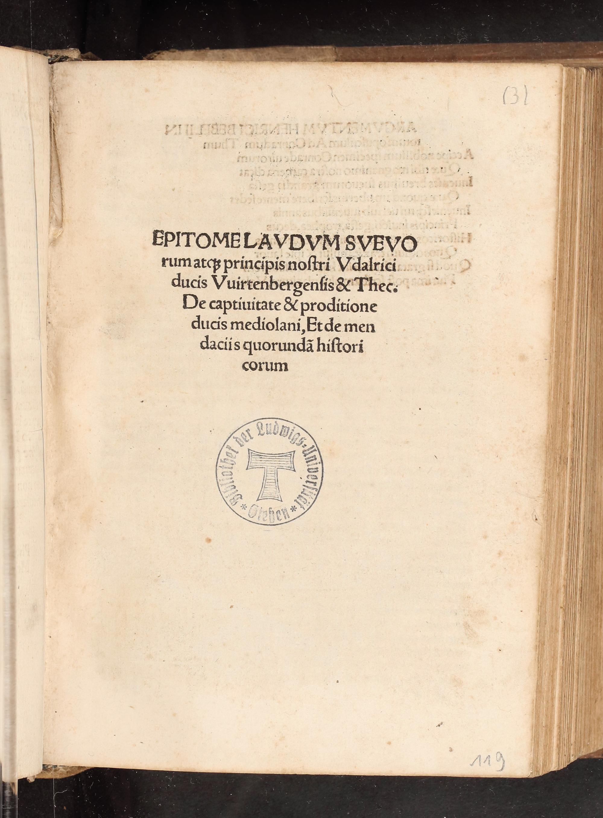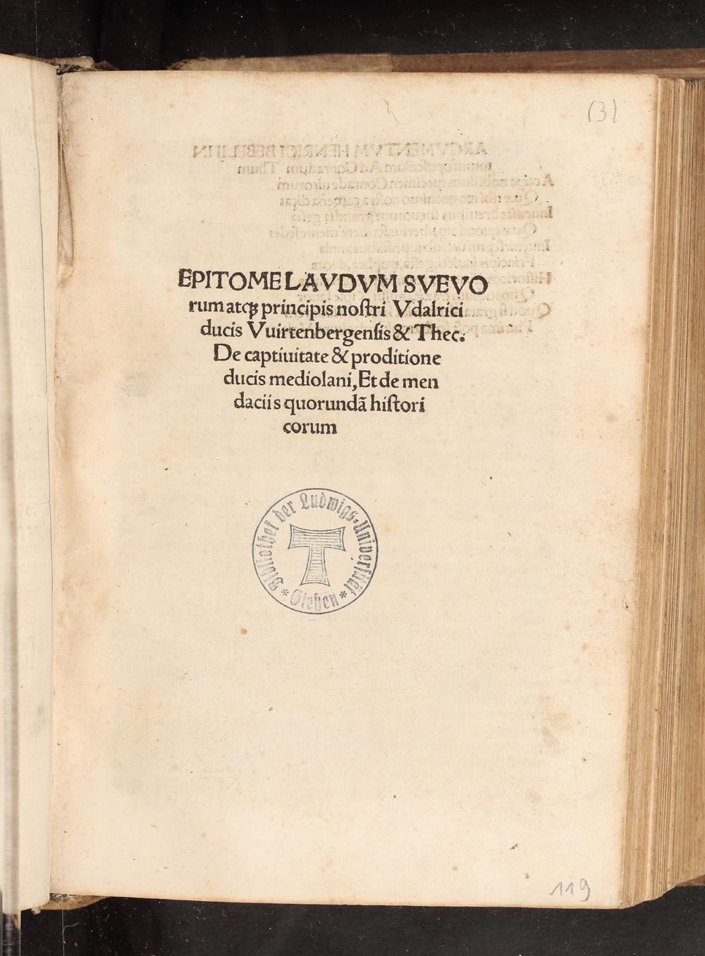 Epitome Lavdvm Svevorum atq[ue] principis nostri Vdalrici ducis Vuirtenbergensis & Thec. : De captiuitate & proditione ducis mediolani, Et de mendaciis quorunda[m] historicorum / [Henricus Bebelius]