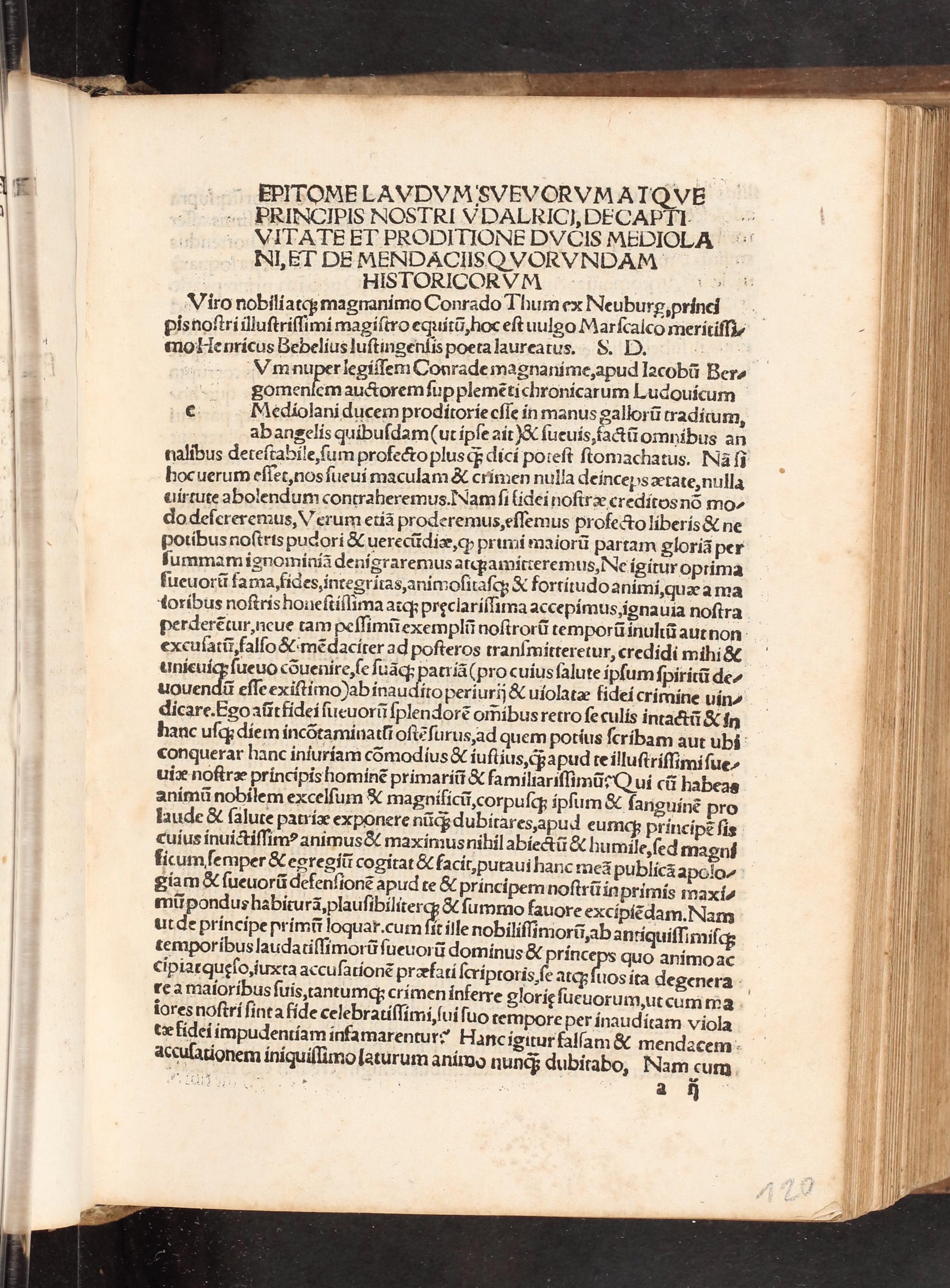 Epitome Lavdvm Svevorum atq[ue] principis nostri Vdalrici ducis Vuirtenbergensis & Thec. : De captiuitate & proditione ducis mediolani, Et de mendaciis quorunda[m] historicorum / [Henricus Bebelius]