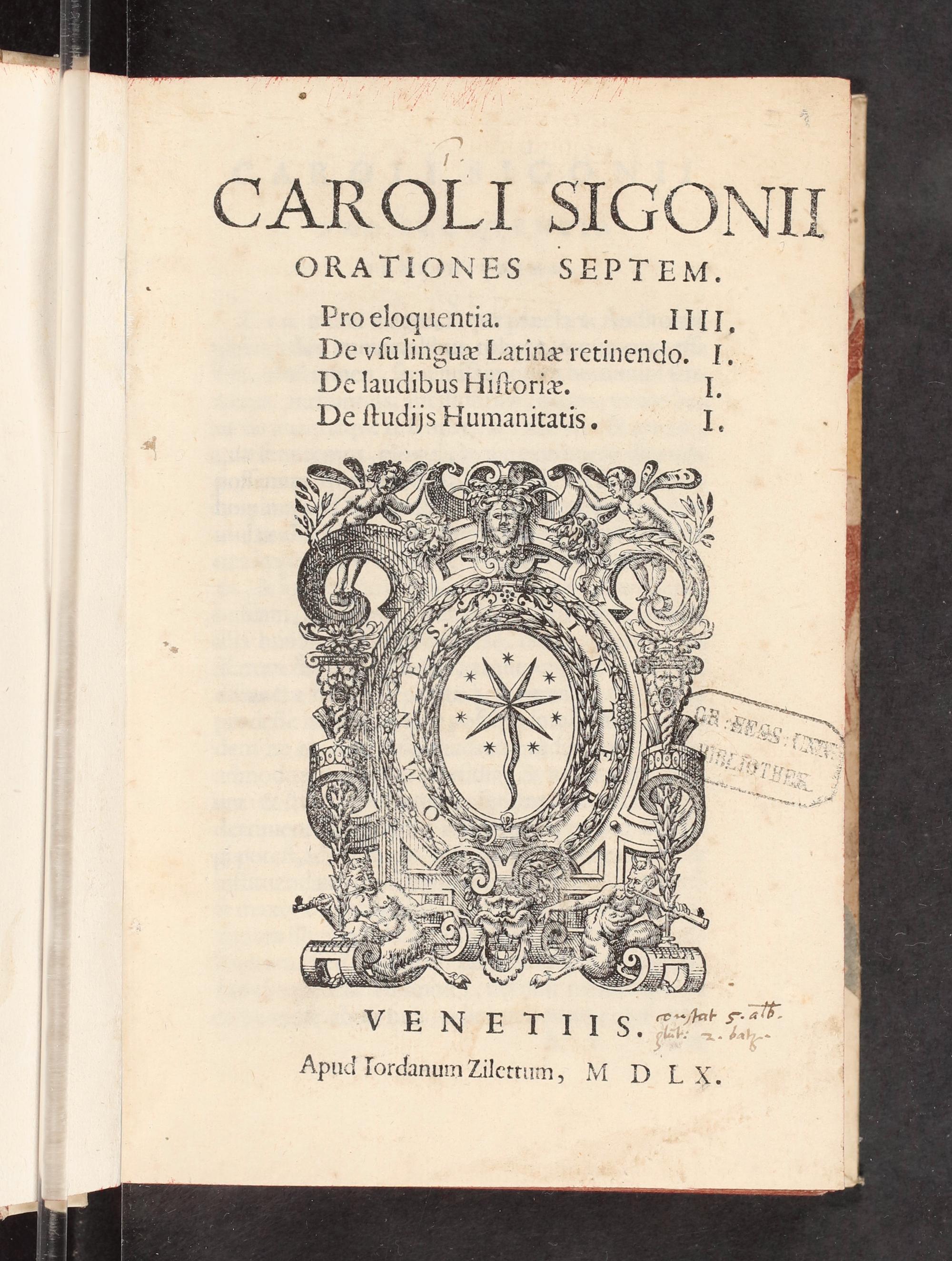 Caroli Sigonii Orationes Septem. Pro eloquentia. IIII. De vsu linguæ Latinæ retinendo. I. De laudibus historiæ. I. De studijs Humanitatis. I