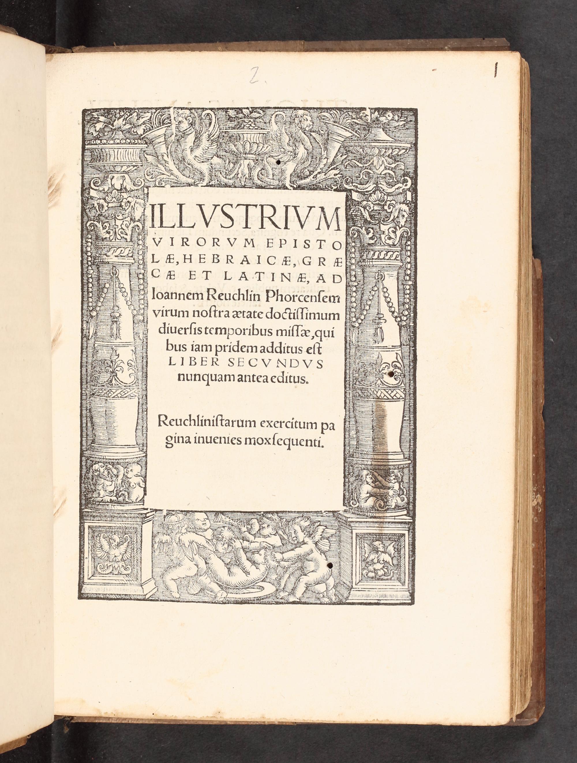 Illustrivm Virorvm Epistolæ, Hebraicæ, Græcæ Et Latinæ, ad Ioannem Reuchlin Phorcensem, virum nostra ætate doctissimum diversis temporibus missæ, quibus iam pridem additus est Liber Secvndvs nunquam antea editus : Reuchlinistarum exercitum pagina inuenies moxsequenti