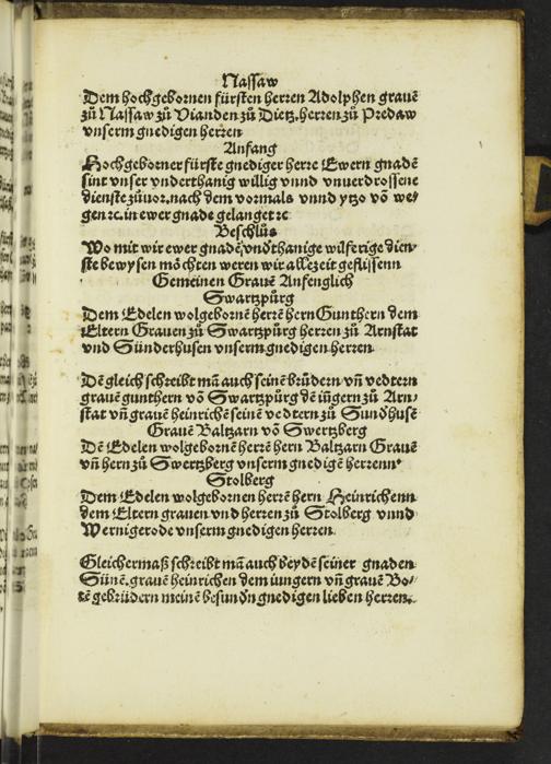 Jn disem büchlin vindet man gar Clarliche[n] Die Tittel oder die Oberschriffte aller Stende, Anfang vnd Beschluß der Briefe, Auch die sitte[n] die ein yeder Cantzellienschreyber an ym sol haben, vff latinisch, vnd volget hernach zu Teütschem, mit anhang eines Krichischen gerichtes anzeigent den schatz eynes yeden gelerte[n] redners