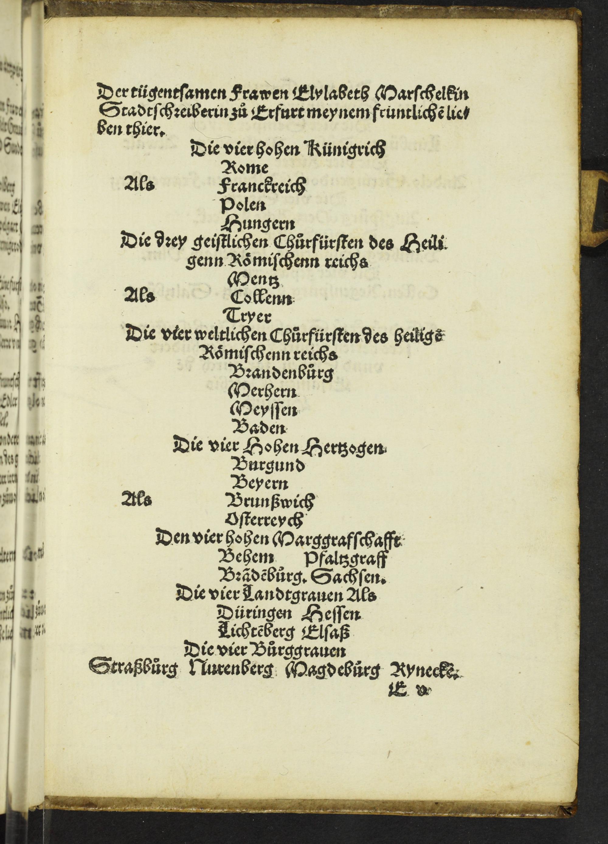 Jn disem büchlin vindet man gar Clarliche[n] Die Tittel oder die Oberschriffte aller Stende, Anfang vnd Beschluß der Briefe, Auch die sitte[n] die ein yeder Cantzellienschreyber an ym sol haben, vff latinisch, vnd volget hernach zu Teütschem, mit anhang eines Krichischen gerichtes anzeigent den schatz eynes yeden gelerte[n] redners